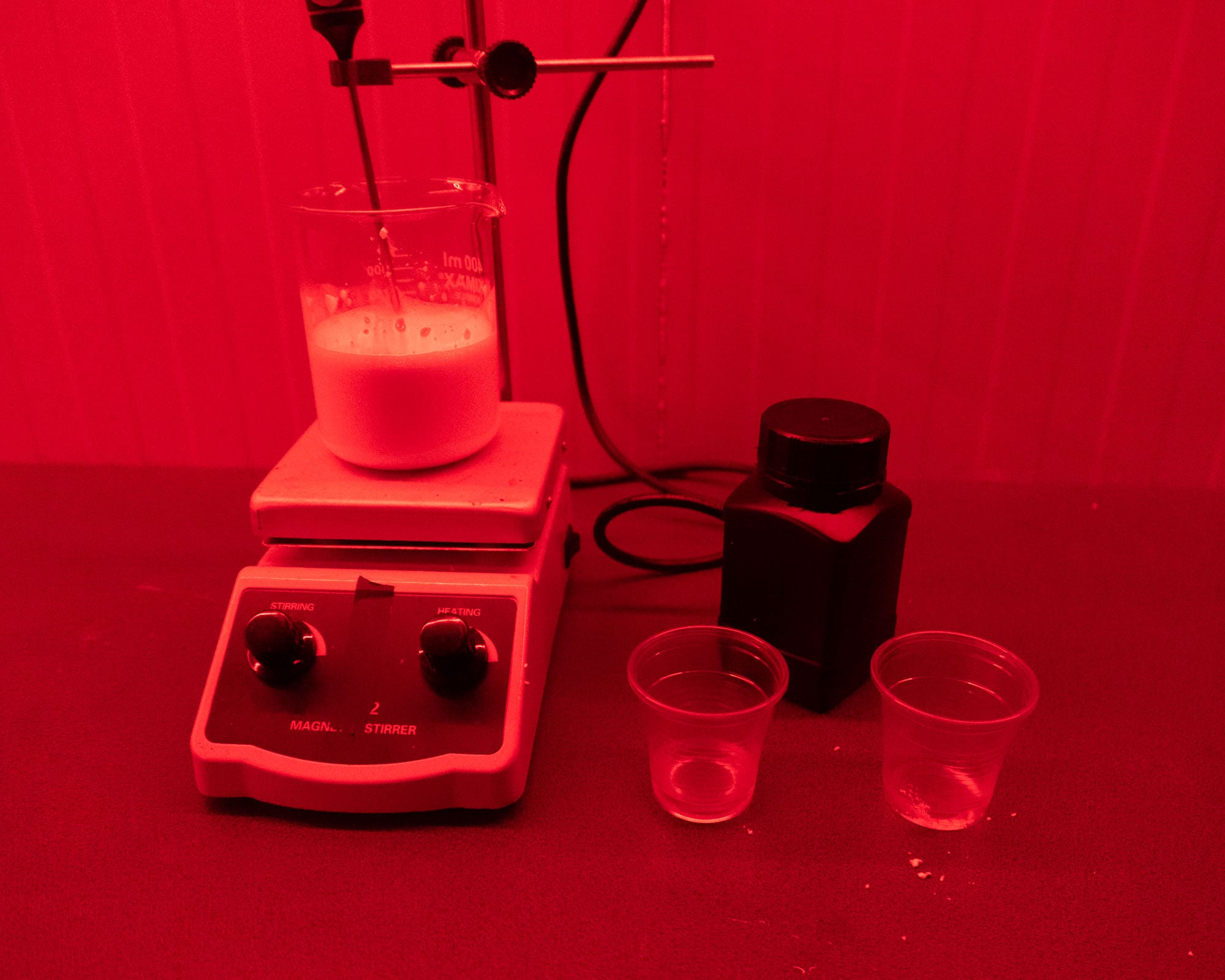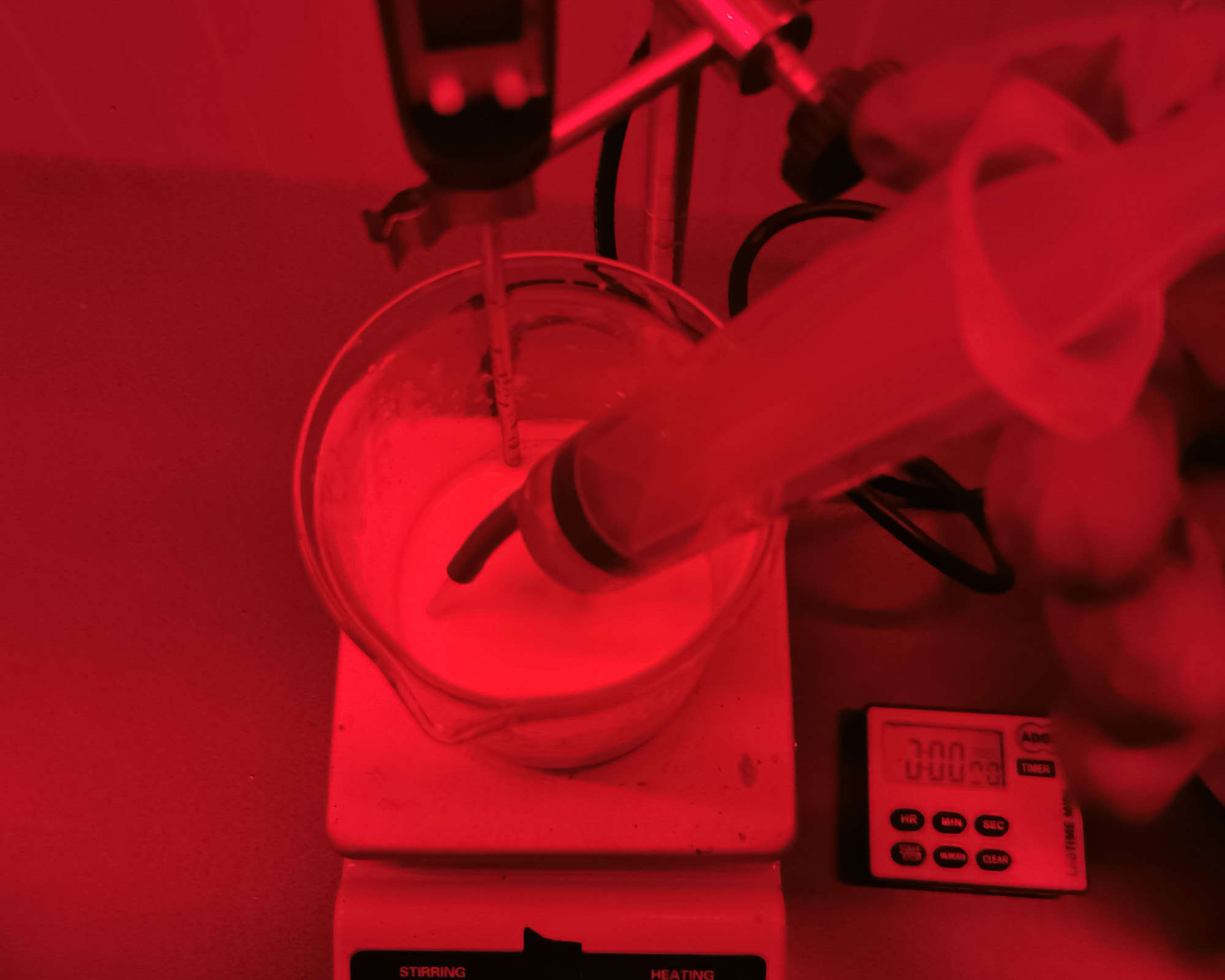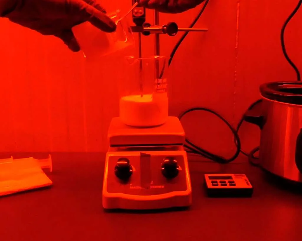 From this point onward, you must work under red safelight conditions. Use your syringe to slowly introduce the heated silver nitrate solution into the halide-gelatin mixture over two minutes. This step forms silver bromoiodide crystalsโthe heart of the emulsion. The solution will turn milky, indicating that light-sensitive crystals have begun forming.