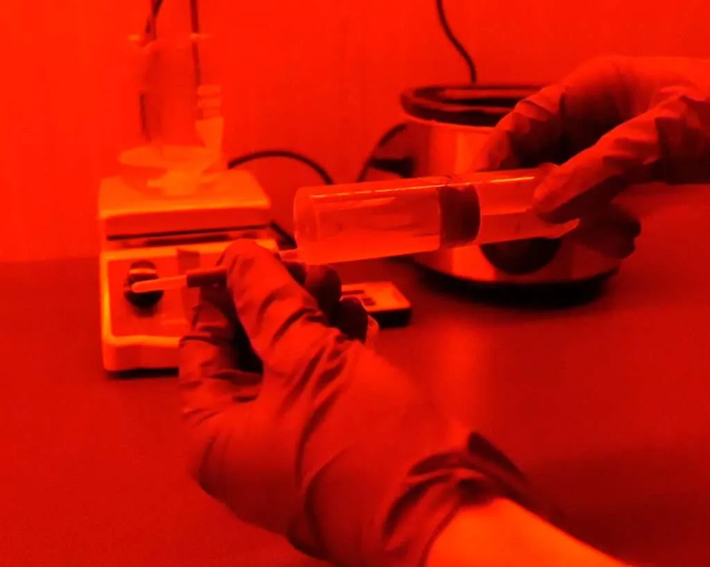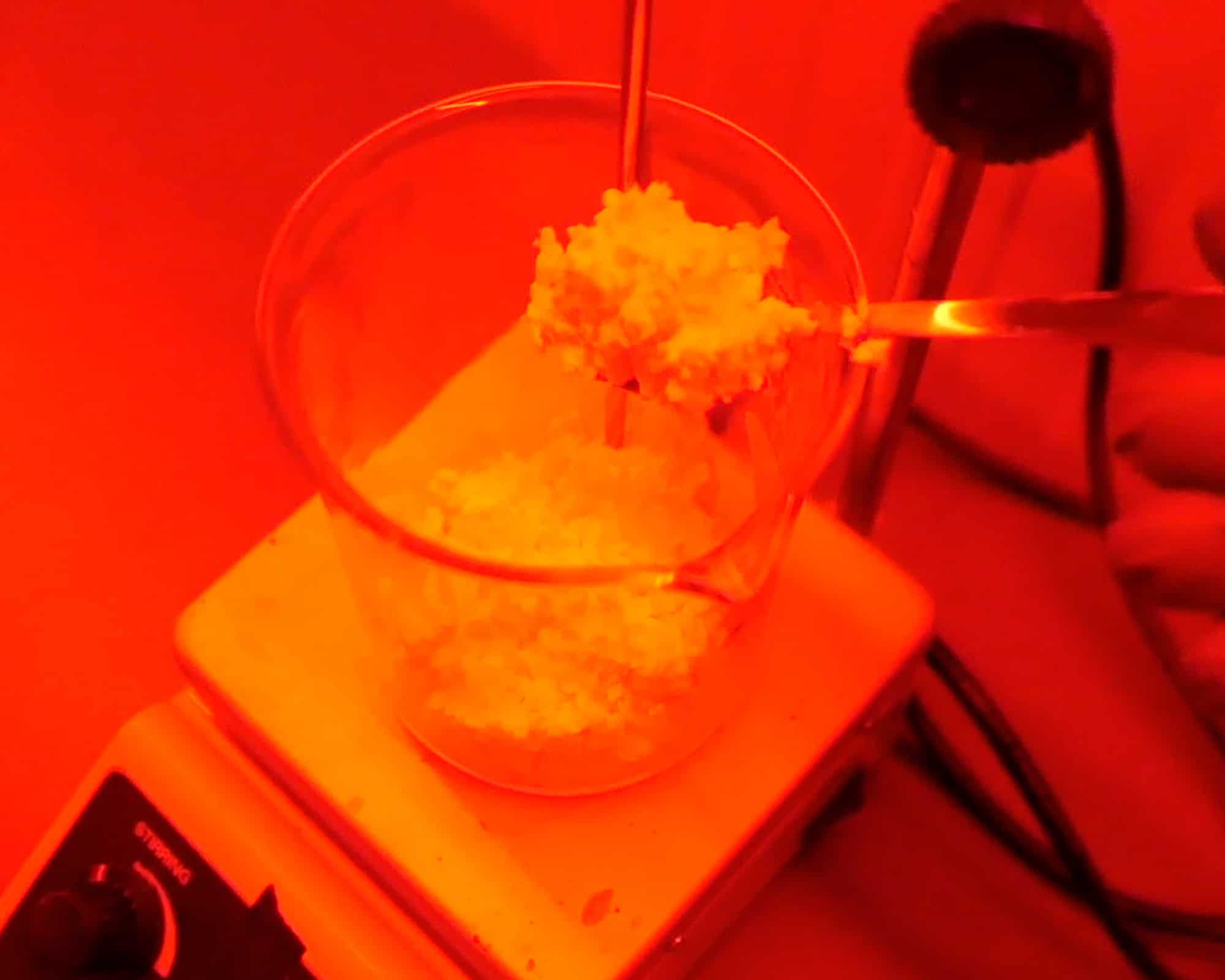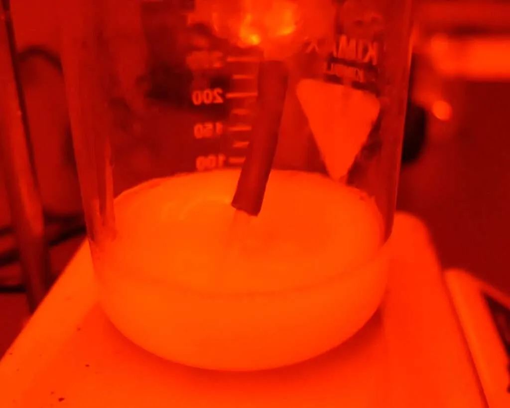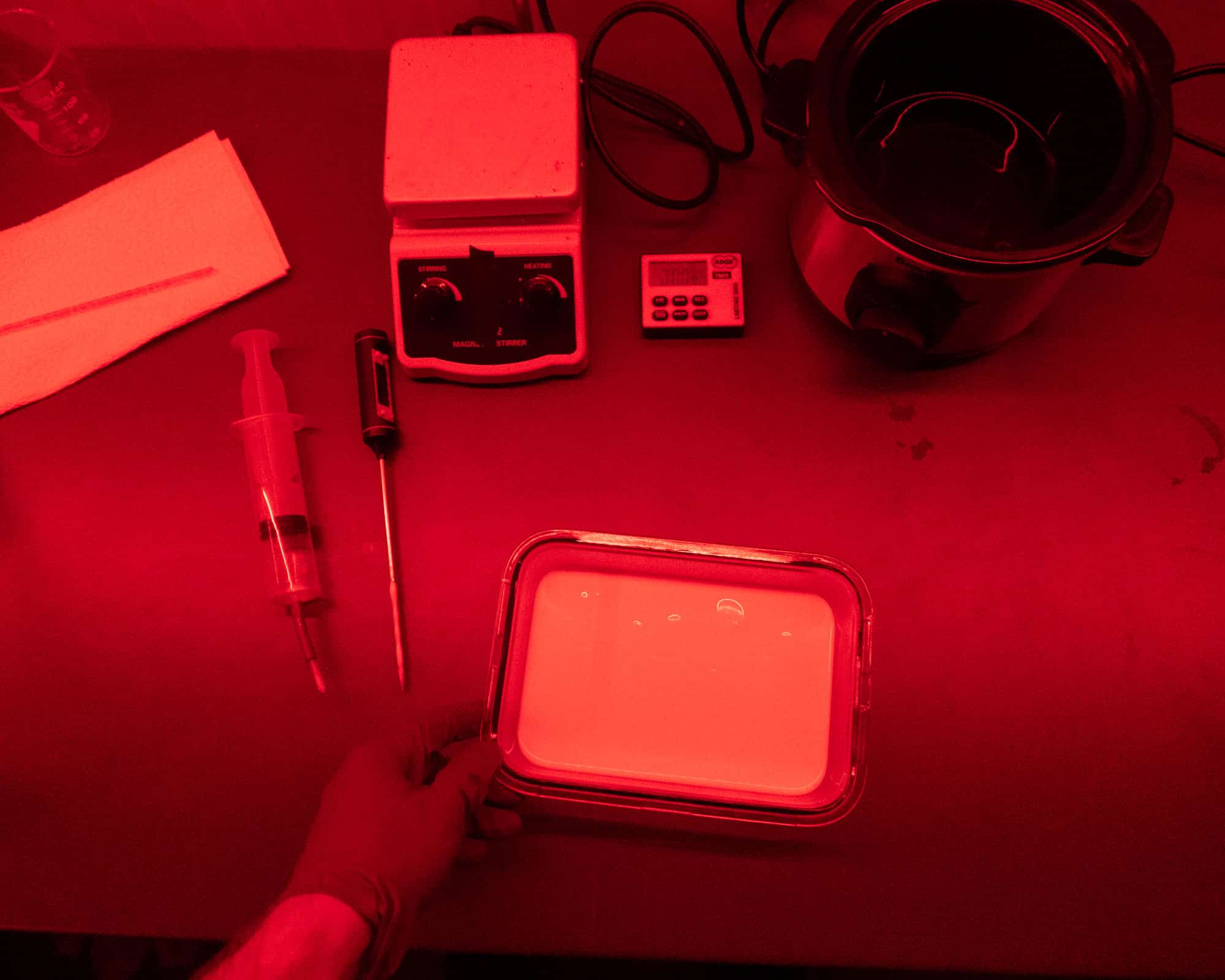 From this point onward, you must work under red safelight conditions. Use your syringe to slowly introduce the heated silver nitrate solution into the halide-gelatin mixture over two minutes. This step forms silver bromoiodide crystalsโthe heart of the emulsion. The solution will turn milky, indicating that light-sensitive crystals have begun forming.