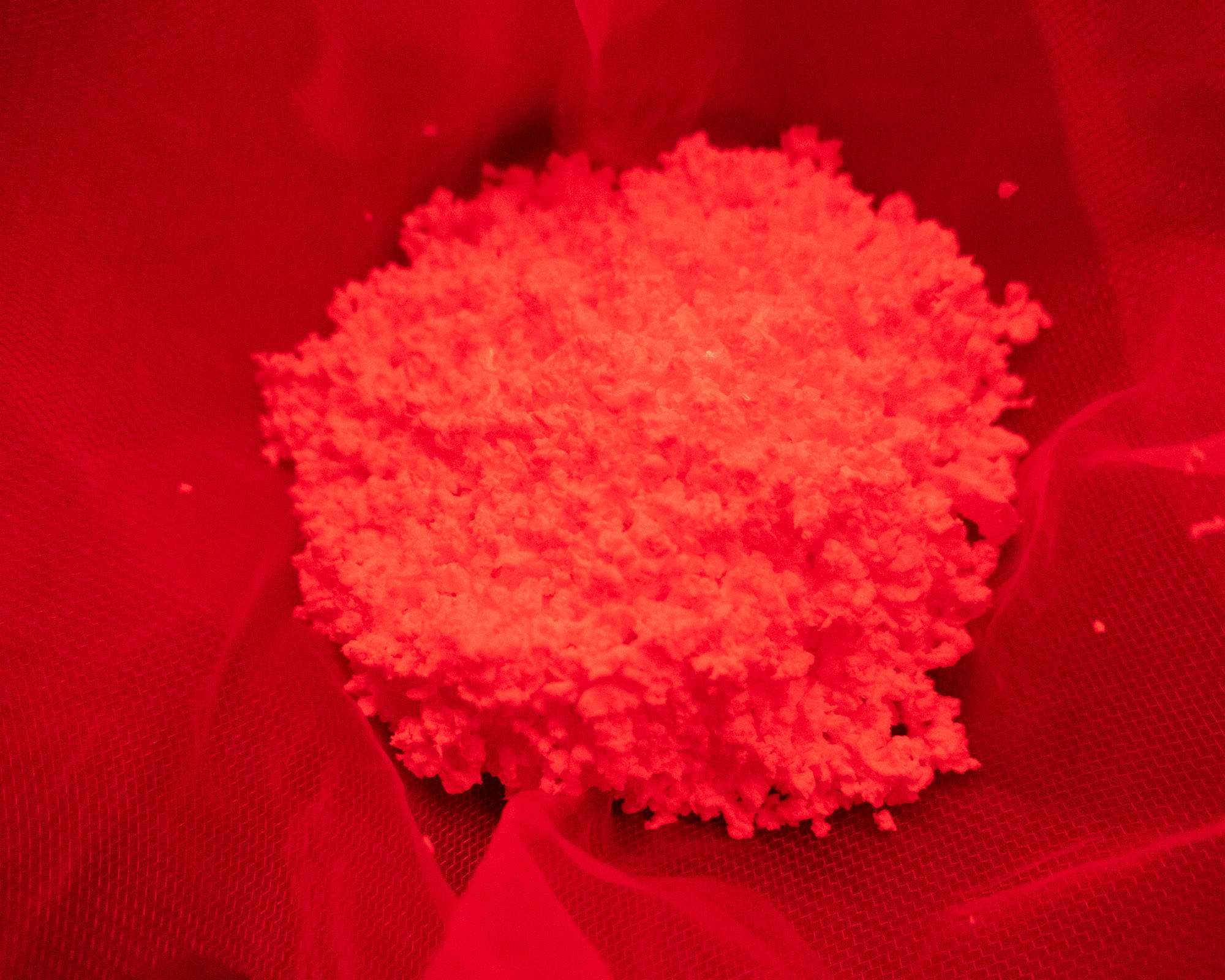 Once chilled, cut the emulsion into small โnoodlesโ using the potato ricer. Place the noodles into a nylon cloth, tie it closed, and wash in several changes of ice-cold distilled water. This step removes unwanted byproducts like potassium nitrate.