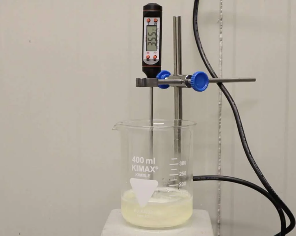 After swelling, heat the first melt gelatin to 50ยฐC (120ยฐF). You can use a magnetic stirrer with a hotplate or place the beaker in a hot water bath. Stir gently until fully dissolved and clear.