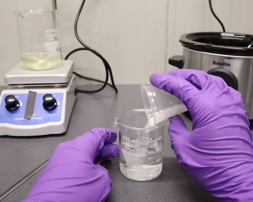 Start by adding 3 grams of gelatin to a 500ml beaker with 85ml of distilled water. Let it sit for at least 15 minutes. This swelling phase allows the gelatin to absorb water and soften, making it easier to melt.