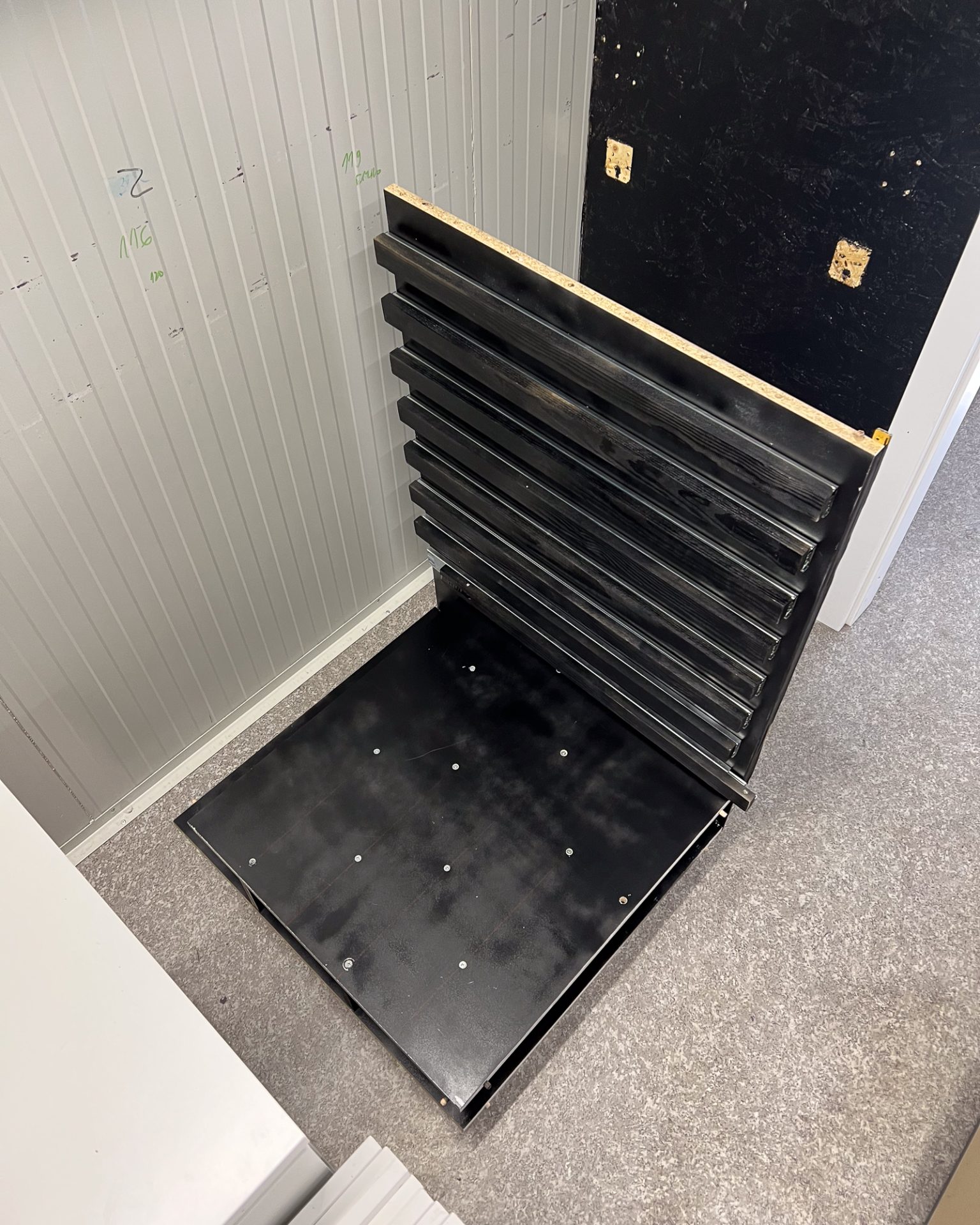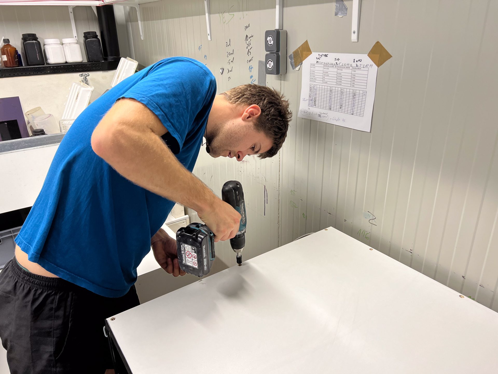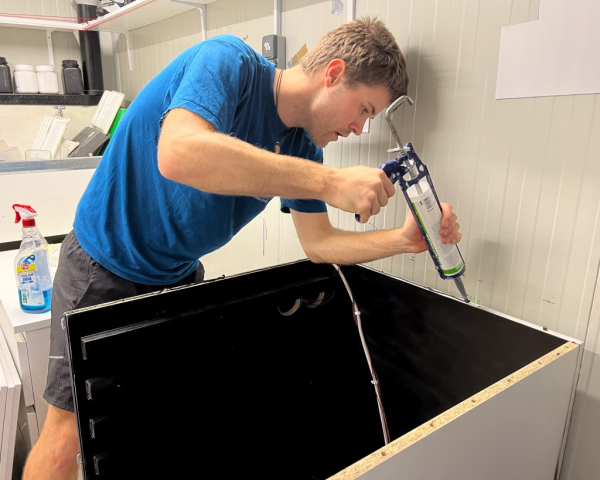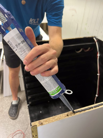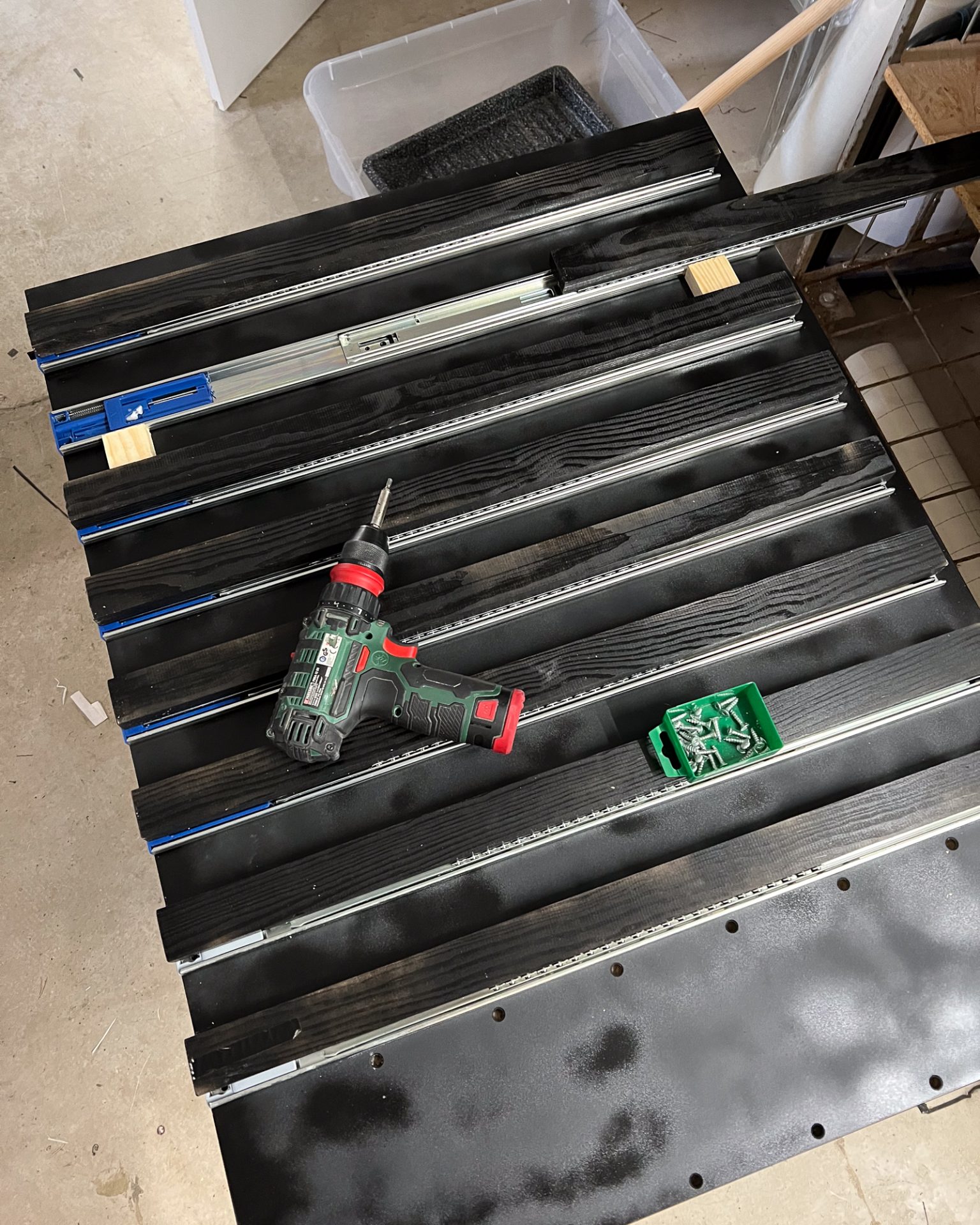 Once the interior surfaces were painted and dried, we started assembling the cabinet. We first built a light maze at the very bottom, then installed the drawer runners on both side panels. We also attached additional wooden boards to the guides, where the shelves would later be mounted. We built the cabinet inside the darkroom itself since it was the only way to make it fit in the small space of my shipping container. We used black silicone between all the joints before screwing things together to ensure there were no light leaks. It was messy, but it worked!