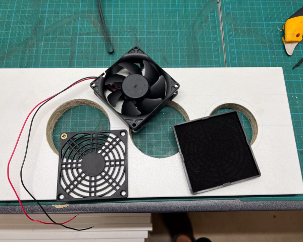 For the inlet fans and the 100W heater fan unit, we made holes in the bottom fan panel and mounted the components. Fan covers with ultra-fine filter mesh were installed to prevent dust from entering the cabinet. After installing the digital temperature controller, toggle switch, and the 12V power adapter, we wired everything up.