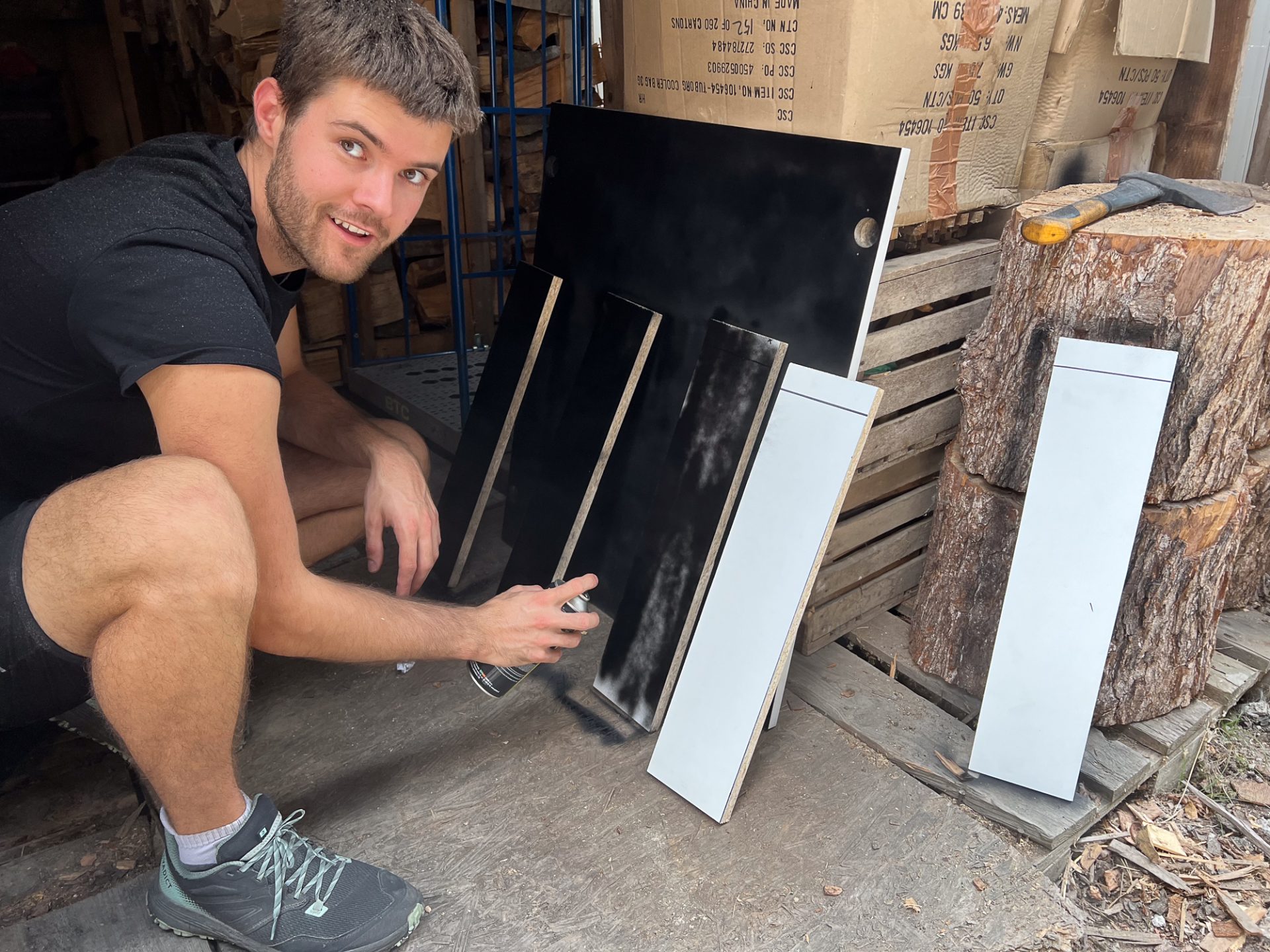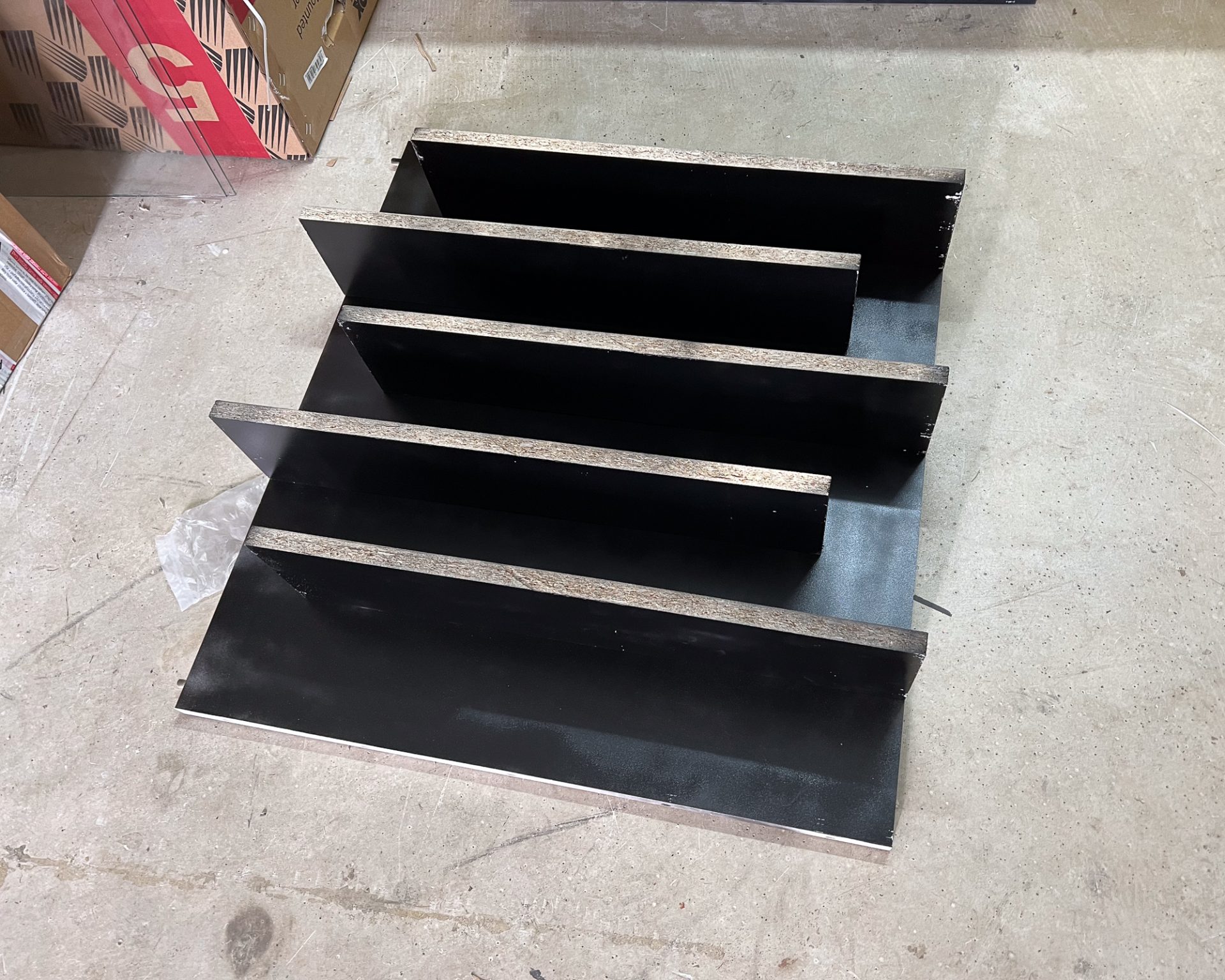 We first painted the interior surfaces with black paint. Black multilayer chipboards were an option, but white was much cheaper even after accounting for the cost of two cans of spray paint. We put the pieces together roughly to see which surfaces needed painting, then applied two to three coats. It was a bit of a workout for the index finger!