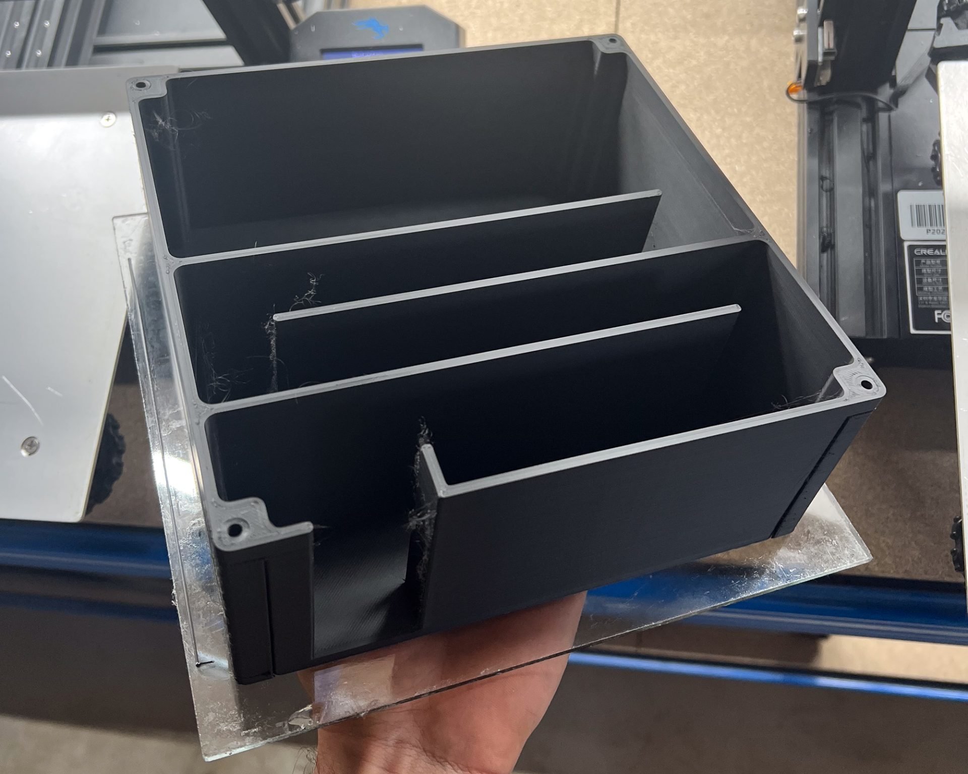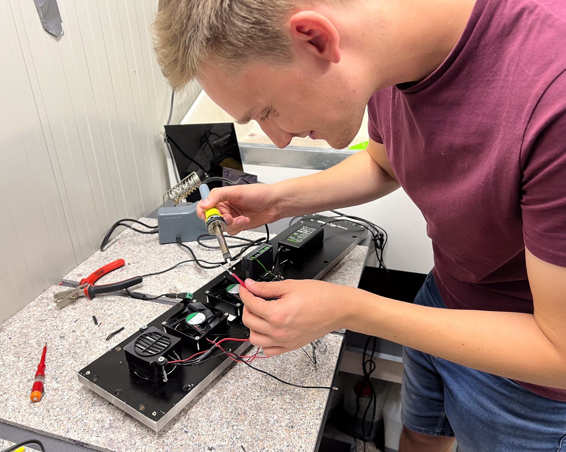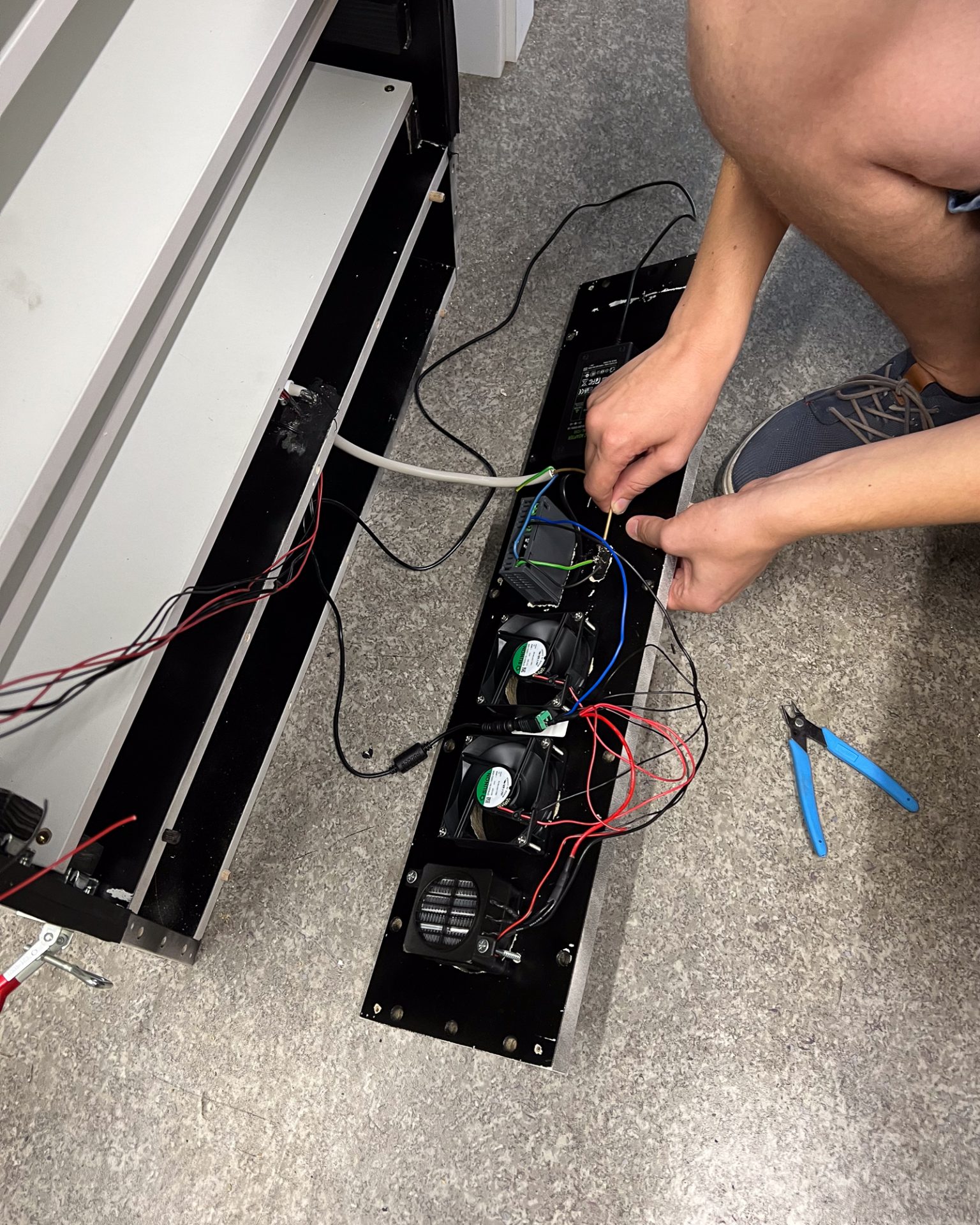 Once the framework was done, we moved on to the complicated part: installing the fans, heaters, cabinet door, and wiring everything up. The cabinet was designed so the bottom front panel, which houses all the fans, is removable and easily accessible in case something breaks. We used four 80x80x25mm fans—two for the outlet on the top and two for the inlet at the bottom. A 3D-printed light maze was used to allow airflow while blocking light. Once printed, we installed the outlet fans and covered them with the light maze housing using screws and black silicone sealer.