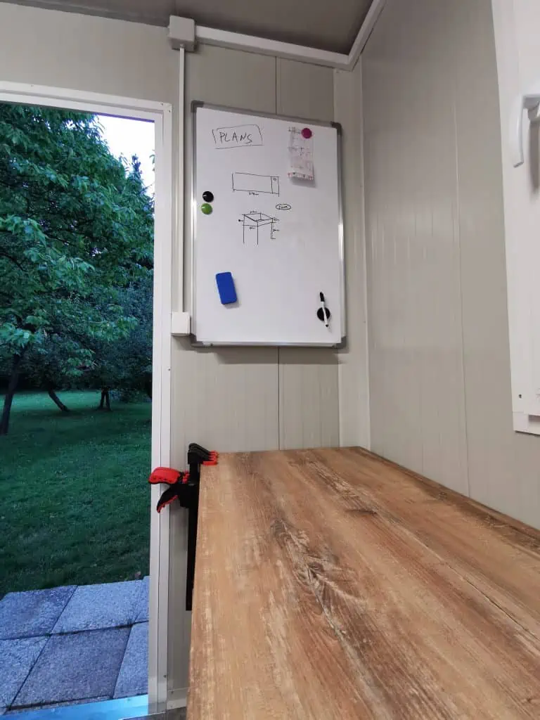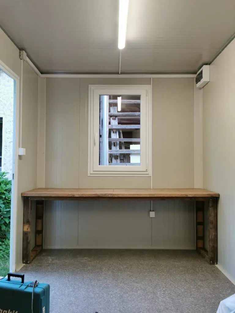 When the construction was finished I added wooden supports to the bottom and started searching for the best paint/coating material. On forums I found quite a few recommendations for West System epoxy which I could not find in Slovenia so I had to order it from Slovakia.While I was waiting for the epoxy to arrive I also built a desk for the light part of the container. I used a left over kitchen counter that was laying around in the garage to which I just added a wooden frame and voila I have a desk now (exact plans can be found on my Patreon page)