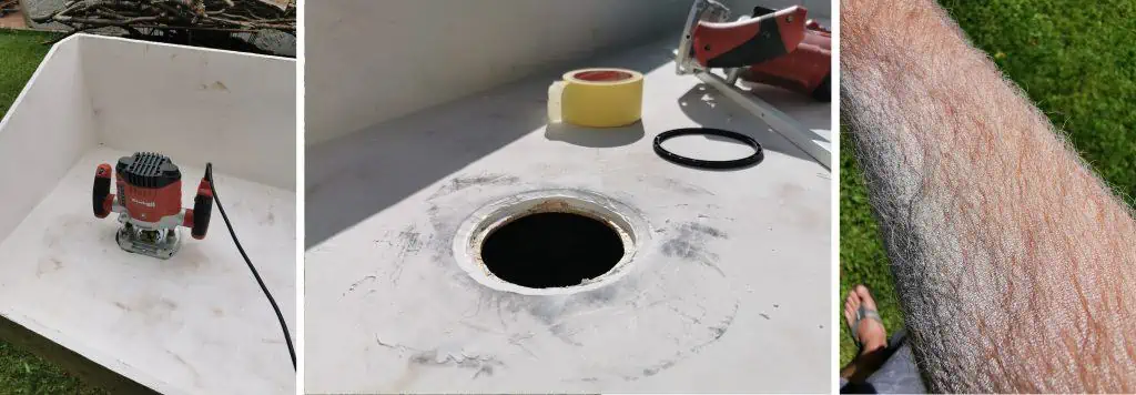 Plastering was quite a challenge tho. Before I started I had to glue the seams with silicone like paste to eliminate the risk of water leakage. Then it was time to plaster. I used almost 1kg of white acrylic plaster throughout the three layers I made. Before the second layer I also routed the holes for the drain and pipes. I decided the drain to be on the side of the sink which will have approximately 1cm drop from one side to the other. This should help draining the water away. The hole was also plastered to fit the drain as good as possible to prevent water/chemicals retention. Thank god I had orbital sander otherwise it would take me weeks to sand smoothly. I paid special attention to the corners so they had a nice curvature which will make painting and cleaning much easier.