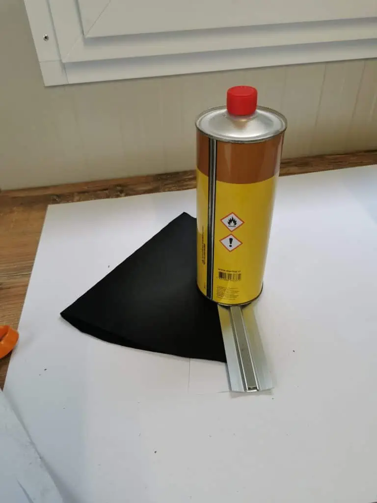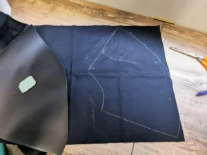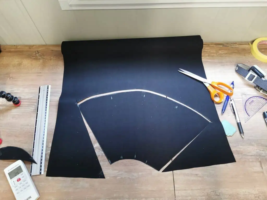 For the inside fabric I went for a very cheap thin balck fabric that cost me around 4eur for a 40cm x 150cm piece. It doesn’t need to be light tight as the whole purpose of it is to hold everything in place. I just copied the outside piece to it with the help of chalk. When that was do it was time for gluing.