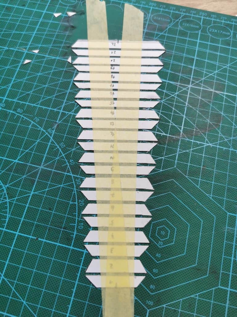 This was probably the most time consuming part of the process. There is sooooo much cutting to be done! I helped myself with some masking tape securing the design down and making sure everything stays in the same position. Sharp exacto knife and metal ruler are a must!