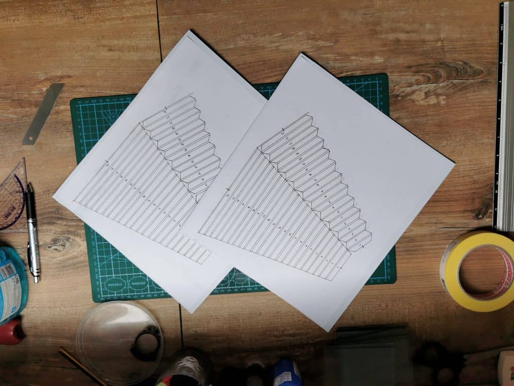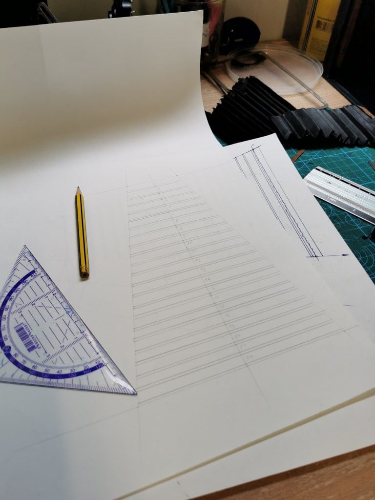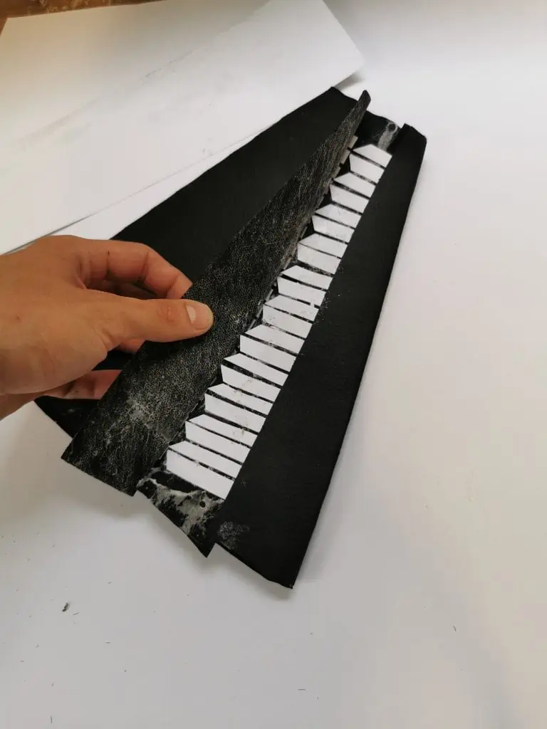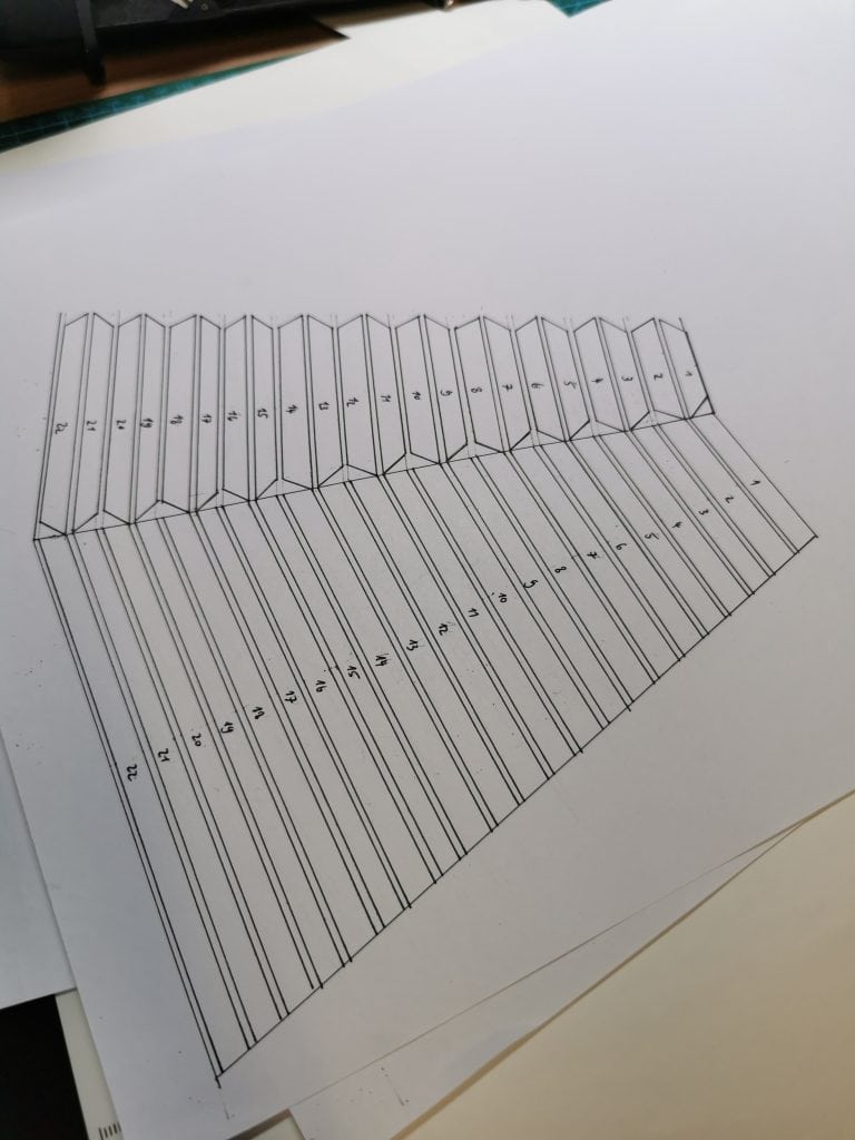 The panels that hold up the form of a bellow need to be made by some sort of thicker material. Ideally I would go for thin plastic but I am a bit tight on the budget and limited with tools so I decided to just go for a thicker paper (200g). I copied my design to a very thin paper which meant I had to glue it on. I used a spray glue and bonded them together.
