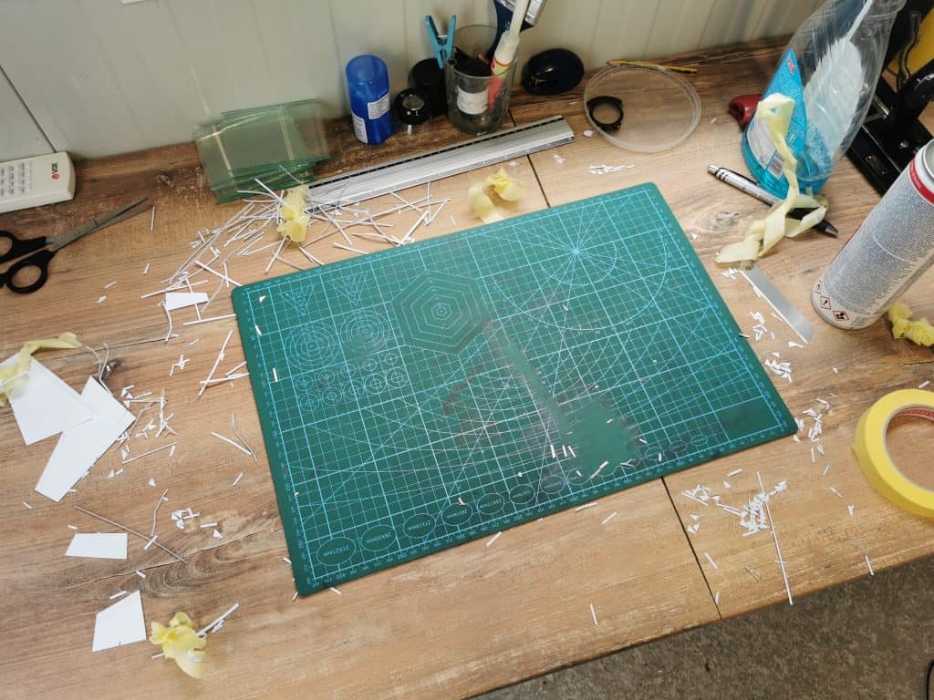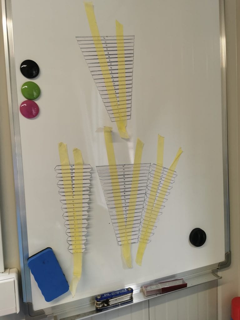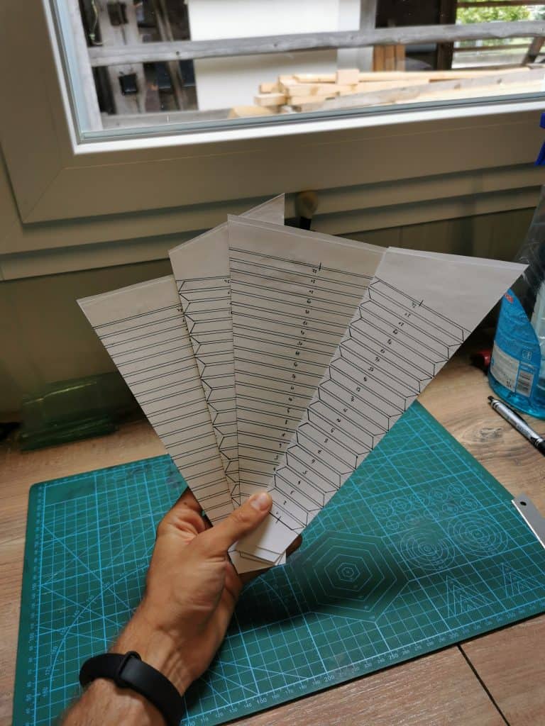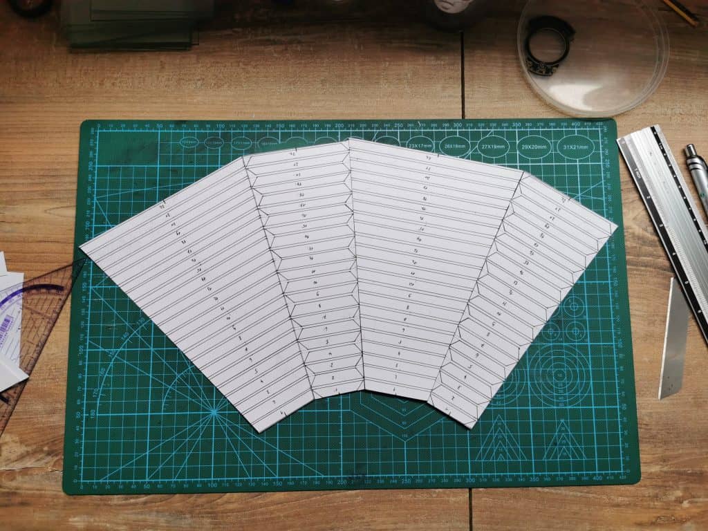 The panels that hold up the form of a bellow need to be made by some sort of thicker material. Ideally I would go for thin plastic but I am a bit tight on the budget and limited with tools so I decided to just go for a thicker paper (200g). I copied my design to a very thin paper which meant I had to glue it on. I used a spray glue and bonded them together.