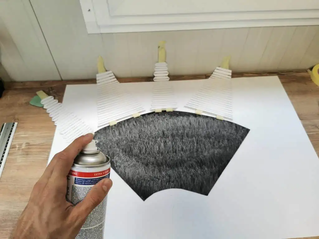 Before I marked the centers of each panel so I could maintain the exact same position through the whole process. I moved the panels back which were held together with masking tape and applied glue. For the adhesive I used spray glue which is quite pricey but does a great job and is easy to apply. I used it for the first time so in some places I used it too much. Make sure to go easy on it but still enough for everything to bond. When the panels were glued I pressed firmly to assure good adhesion. Ideally they need to dry for a few hours.