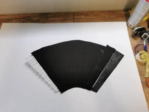 When I finally got all the designs cut it was time to glue it to the outside fabric. I didn’t know what kind of fabric to use, I just knew it needed to be light tight and thin enough for folding. I made a visit to the closeby fabric store hoping they will be able to help me. They were very kind and brought many fabrics to the table. At the end I decided to go for a thin synthetic black leather which was totally light proof. 40cm wide and 1,5m long strip cost me around 6eur (I can make a few bellows from that). To keep everything in position I helped myself with masking tape again. For the technique make sure to watch my video tutorial above.