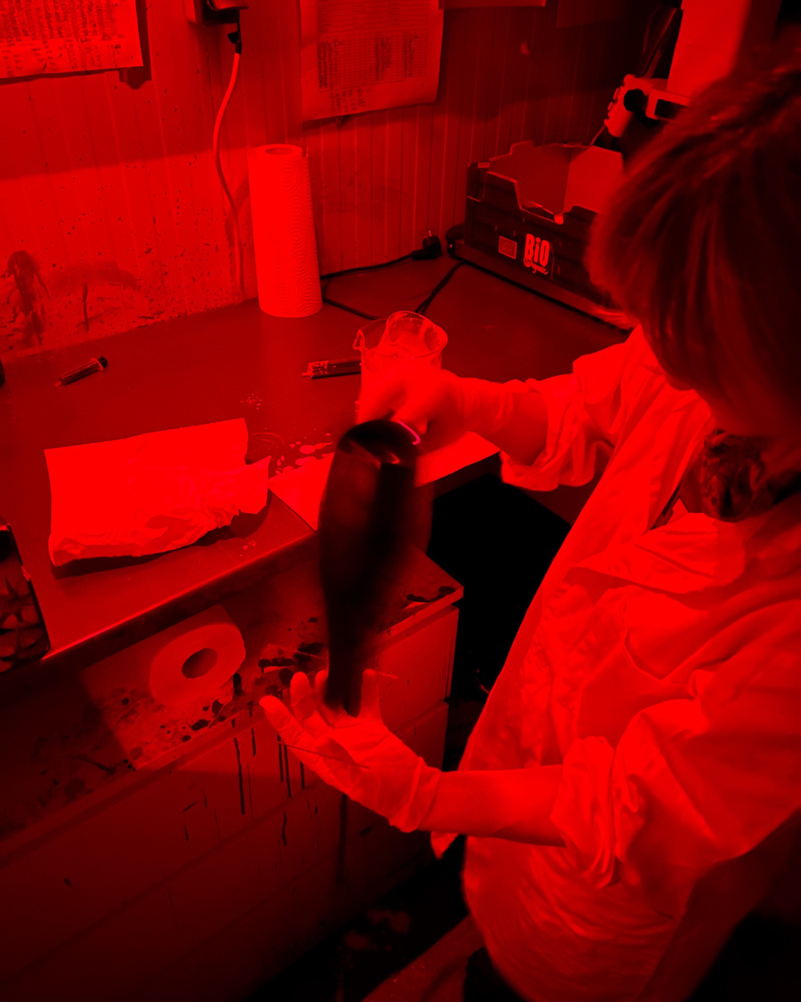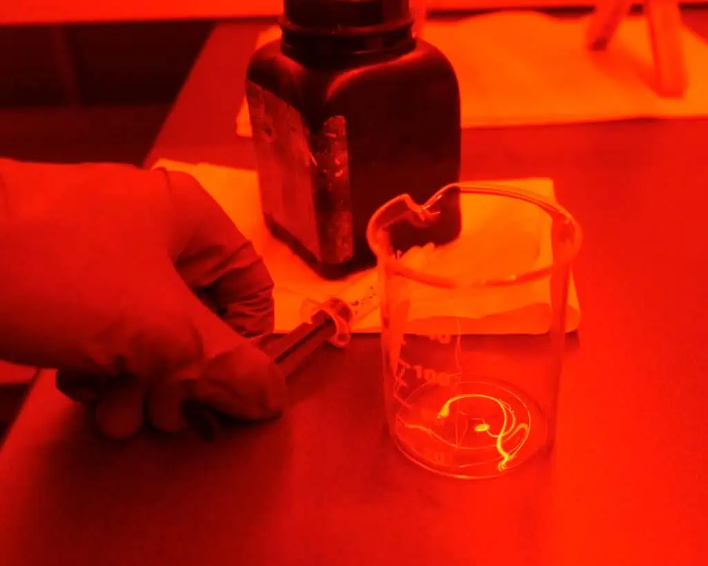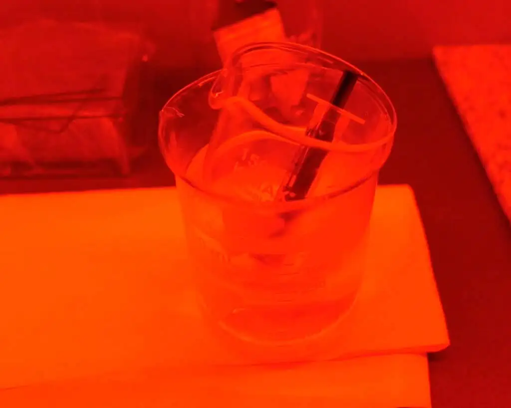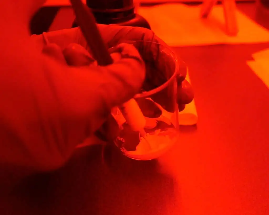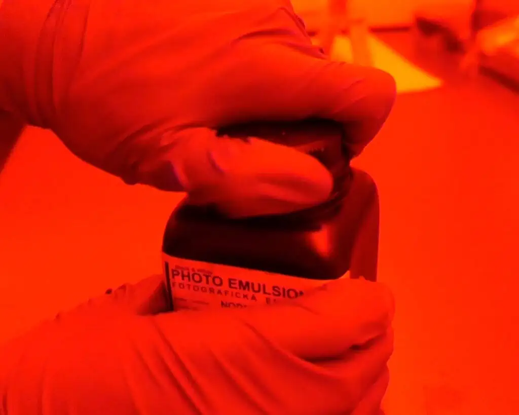 Now that everything is clean and your emulsion is fully melted, itโ€™s time to switch to safelight conditions. At this stage, make sure to turn off all other light sources and continue working only under red safelights.