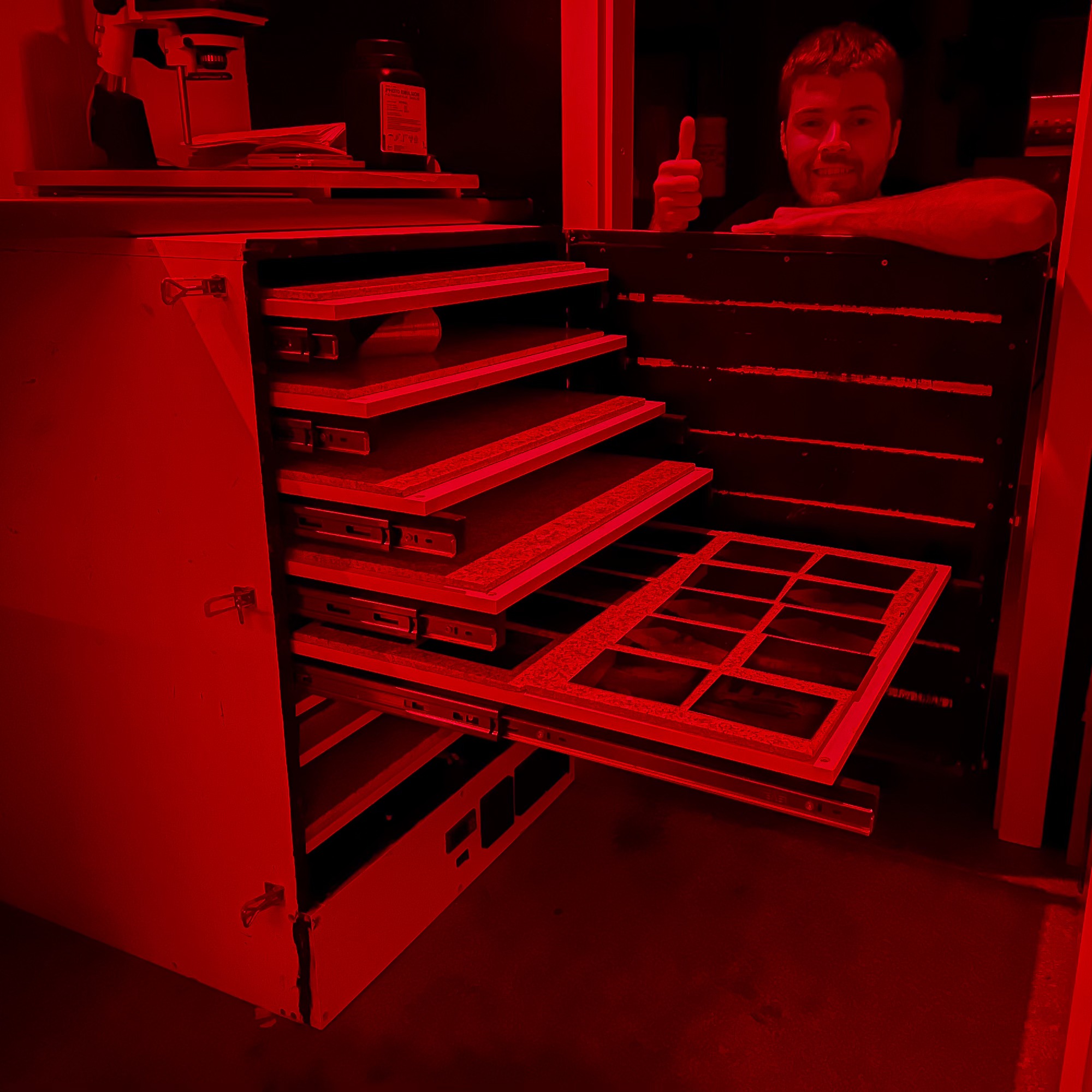 Once the emulsion has set, the plates are ready for drying. You can place them in a light-tight drying cabinet, or, if your darkroom has double-door entry, simply leave them to dry in a dust-free area. I built a custom drying cabinet that holds up to 300 4x5in plates and includes a fan and heater to speed up the process. You can check it out here.