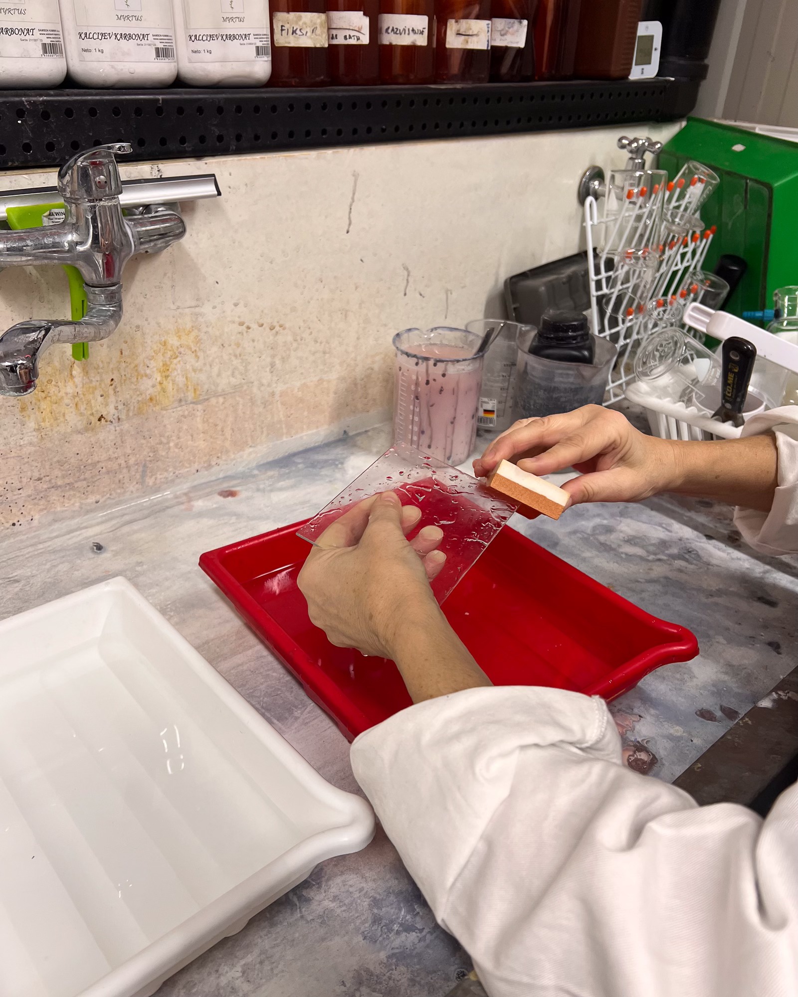 How to hold the plate? Rest it gently on your fingers from below. This gives you control and allows you to tilt the plate smoothly, guiding the emulsion across the surface. I usually start pouring from one corner and let the emulsion flow in an even wave from left to right.