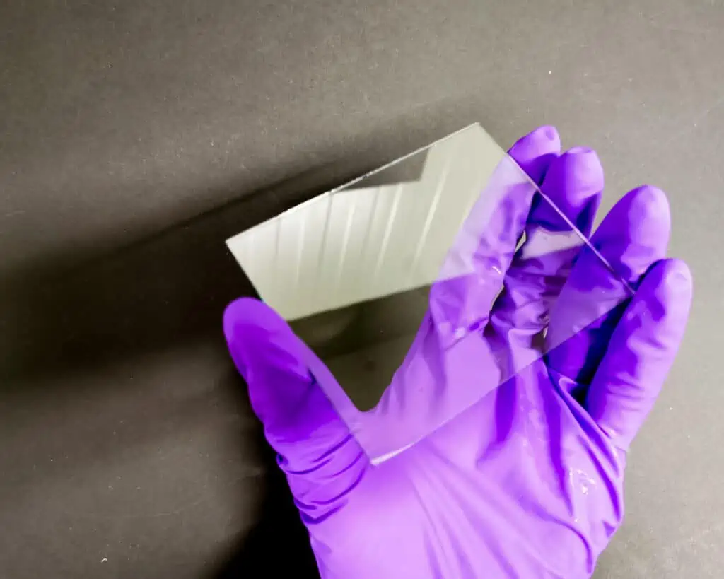 Once the water has drained, dry each plate thoroughly with paper towels. To check if the surface is really clean, breathe gently onto the glass. The fog should disappear evenly without streaks. Once they pass this test, place them back on the rack until you are ready to coat.