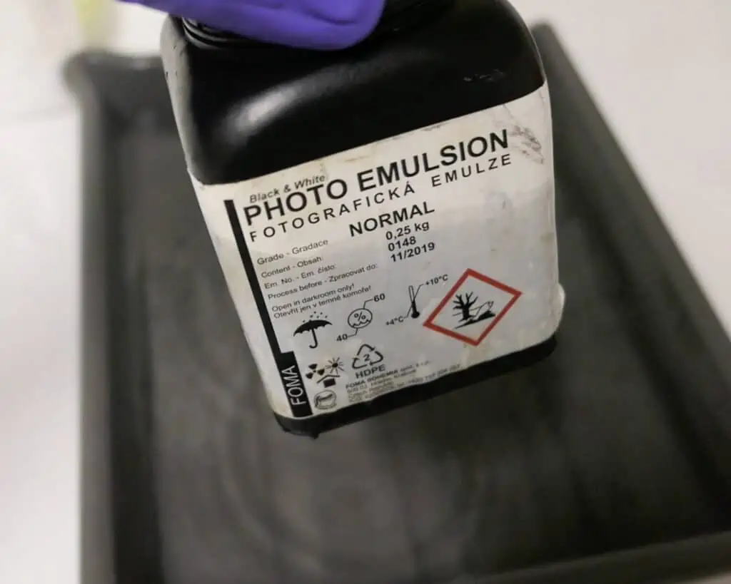 Commercially produced emulsions usually come in light-tight black plastic containers. The main ingredient in all photographic emulsions is gelatin, which starts to liquify at temperatures above 30ยฐC. This is helpful, as you can take the black container with emulsion straight from the fridge and place it into a hot water bath to melt it gradually.