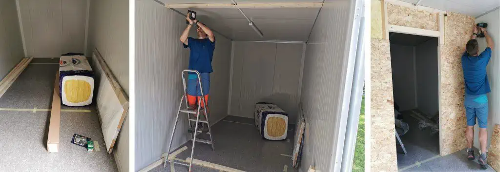I am crazy excited to start working and designing my own working space. As I said in my previous post I will be splitting the container thru the middle to get a darkroom and lightroom space. Because of this I had to construct a partition wall. I used 8x5cm wooden slats to build a frame. I was using a miter saw which really makes everything so much easier. Also the walls of the container are made of metal and insulation which makes them only 4,5cm thick. I had to be careful when selecting the screws so they were not too long and that they were still thick enough to assure good bondage. It took me a few hours to complete the frame and screw it to the container walls. Next step was covering the walls with 15mm OSB plywood which took much longer as each plate had to be measured and cut with a circular saw. In between each side I also laid glass wool for heat and foremost sound insulation. I had to leave an empty space in the middle so the 60cm door would fit. OSB plates were coming together nicely so I could proceed to the next step.