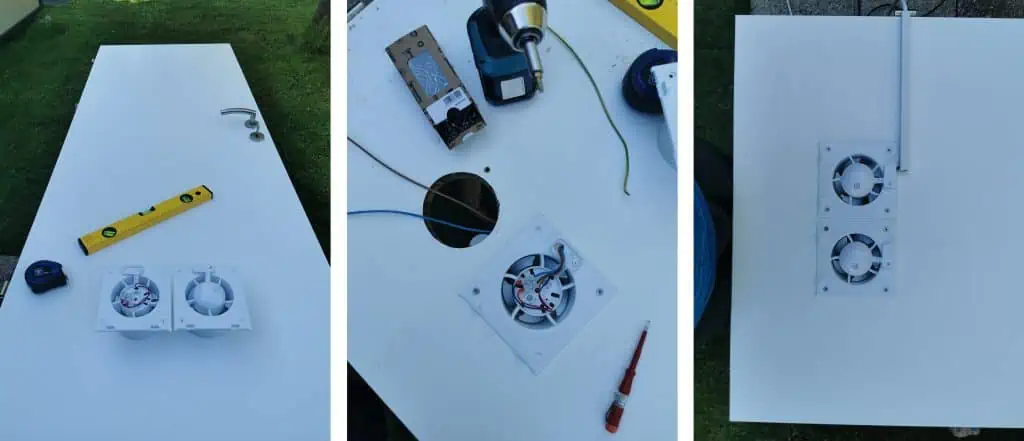 Two toilet fans I bought were installed on the door to suck in fresh air. They are very quiet (30dB) and can together move 140 cubic meter per hour. The installation went smoothly, drilling and sawing out two holes was easy. The wiring was a bit more difficult, especially as I wanted to hide all the cables in the door. I managed to instal everything as I wanted and connect it to the switch. In the following posts I will be making a darkroom sink, ventilation for the sink etc.