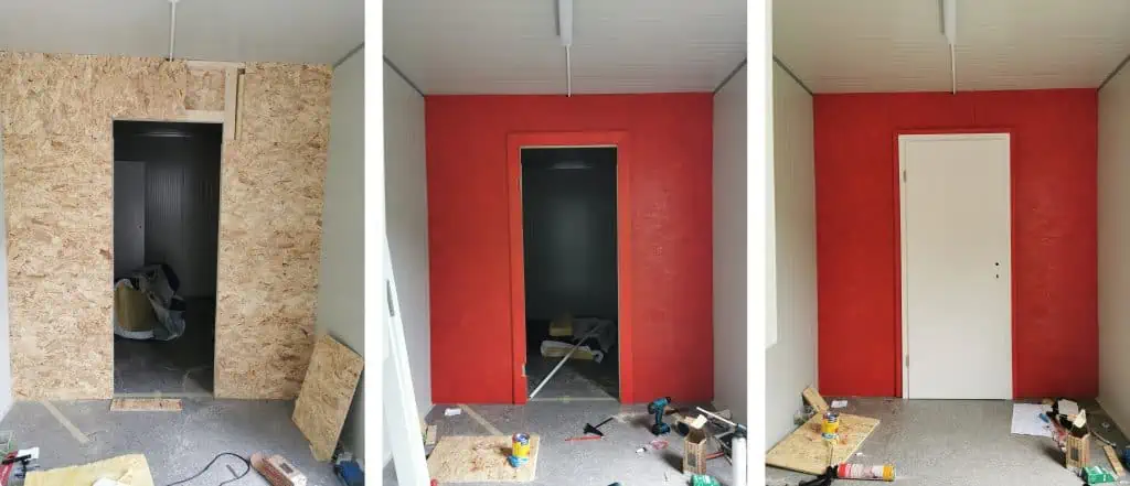 I am a very precise person so all the measurements and cuts that I make fit really snugly which let me tell you is not the best thing when installing a door frame. I had quite a lot of trouble installing the frame because everything had to be perfectly aligned, leveled… At the end All I had to use was just a few screws, a little bit of propane foam to make it light tight and I had to make an additional 1cm thick frame around as the door frame was designed for a bit thicker wall. I went for a 60cm wide door in the middle so the left and right walls are free for installing cabinets, desks etc. When the wall was finished and doors mounted I decided to paint the wall. Vibrant red came on my mind first because it in one way represents a darkroom environment with all the safelights on. For the final touch I installed white plastic white edging which also helped eliminate light leaks.
