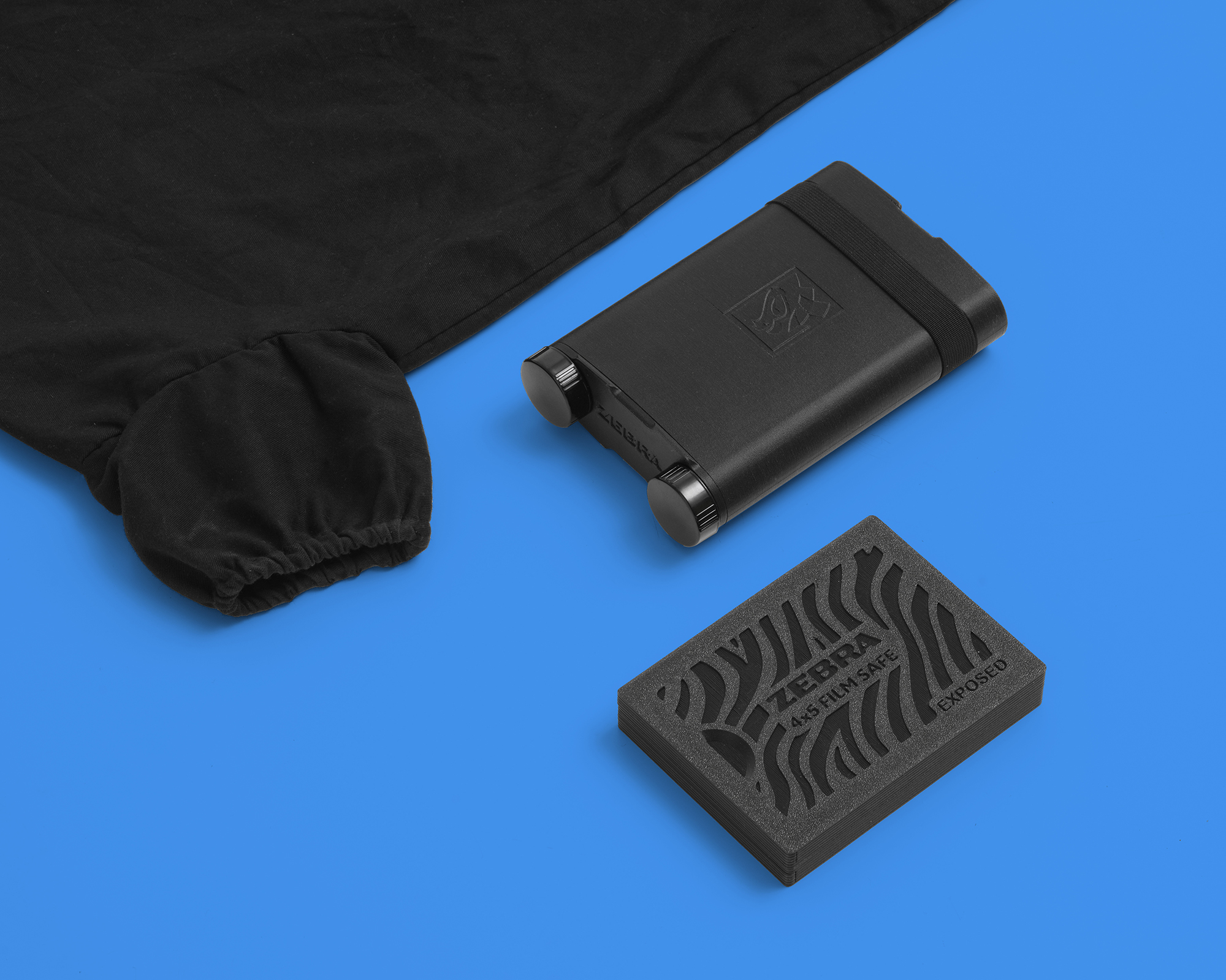 Each kit includes a Zebra Daylight Processing Tank, a film changing bag, and our new Zebra Film Safe a rugged, light-tight storage box for safely organizing exposed and unexposed sheets in the field. The Film Safe has two magnetically secured compartments with textured lids, so you can quickly tell them apart by feel, even in the dark.