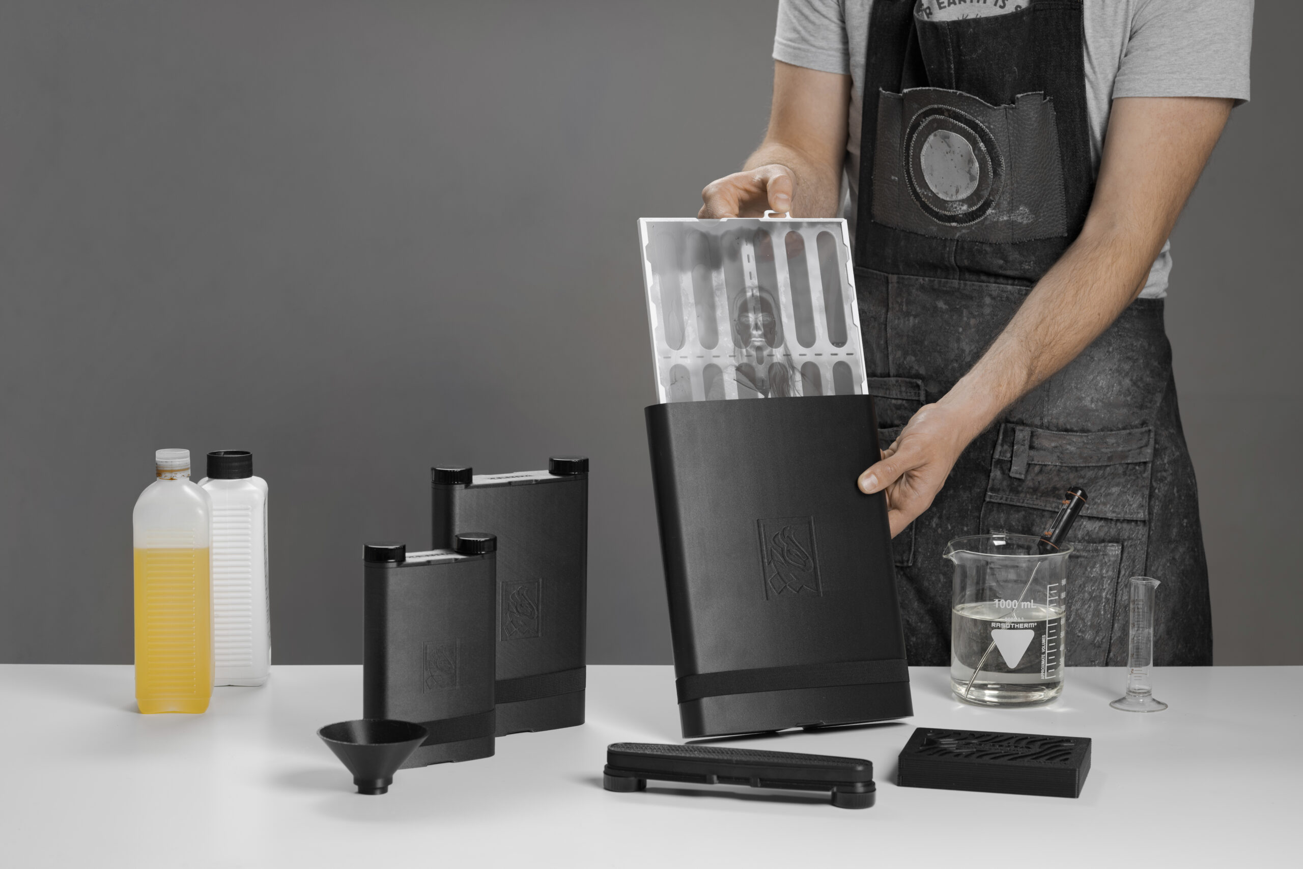 The tank is fully light-tight, leak-proof, and made from chemical-resistant plastic. Inside the lid is a hidden light maze system that enables incredibly fast filling and emptying from either of the two caps, without exposing your material. Everything is engineered for reliability and ease of use.