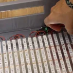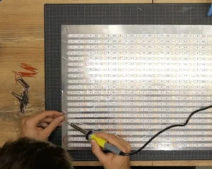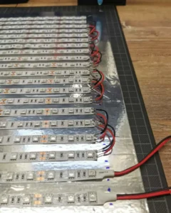 Once the strips were cut, I marked their exact positions on the shiny support to ensure the exposure would be as even as possible. Then, I started adhering the strips piece by piece, leaving a 0.6cm gap between them until I got a beautiful LED screen. It would have been great if I could just plug it in and start printing, but there was a lot of soldering to be done beforehand.