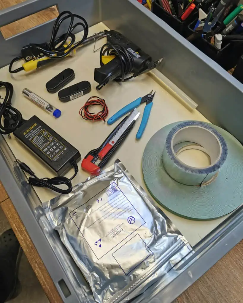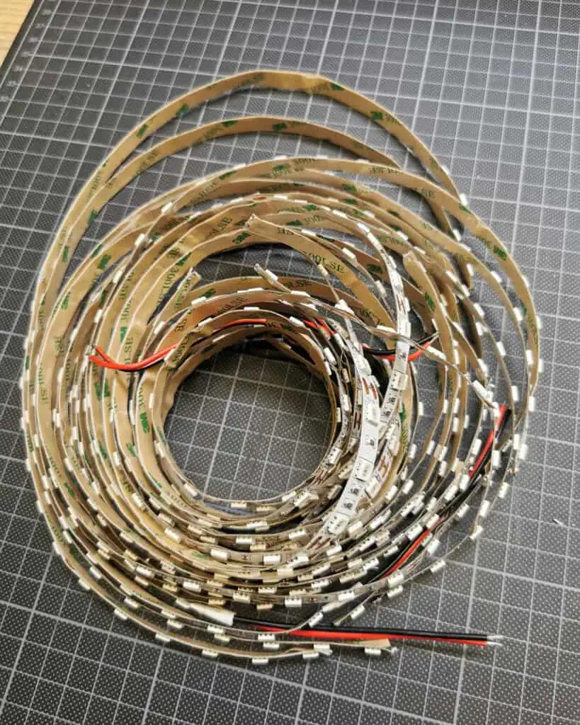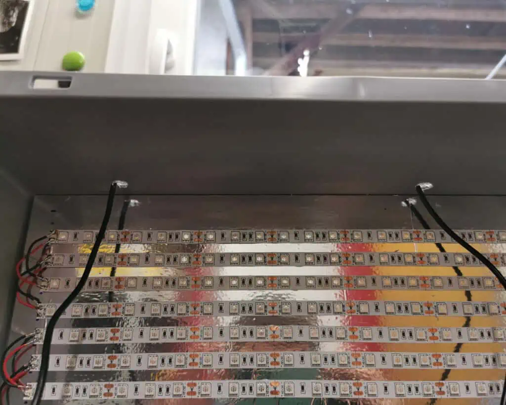 I received the LED strips in the mail, and the box was ready to go. To make the process easier, I decided to spend a few extra euros on a thin sheet of plywood on which I mounted the LEDs. I could have just attached them directly to the inside of the box, but soldering and wiring would have been much harder.