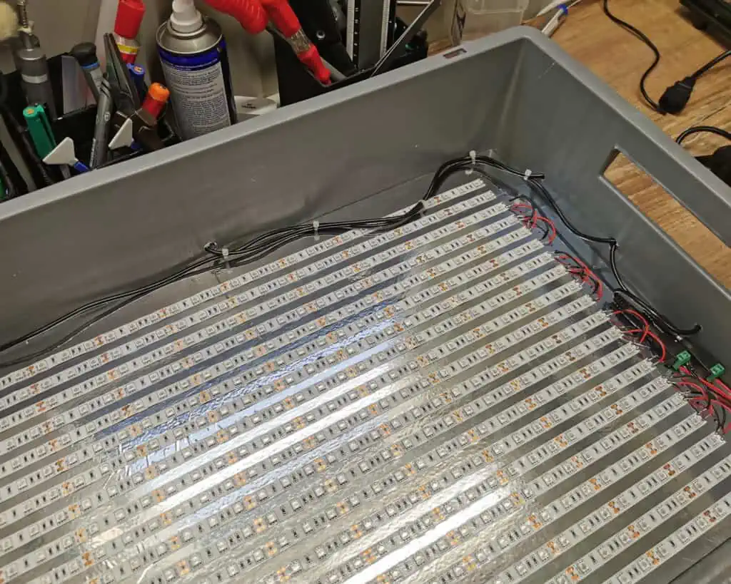 The lights arrived in about a week, and in the meantime, I was thinking a lot about how to design the enclosure. A wooden box was the first thing that came to mind, but it can soon get very heavy and inconvenient to store, plus you need some woodworking skills. I could easily build one, but I kept exploring and, through reading forums, I got the idea to install the LEDs in a simple ready-made plastic storage box.