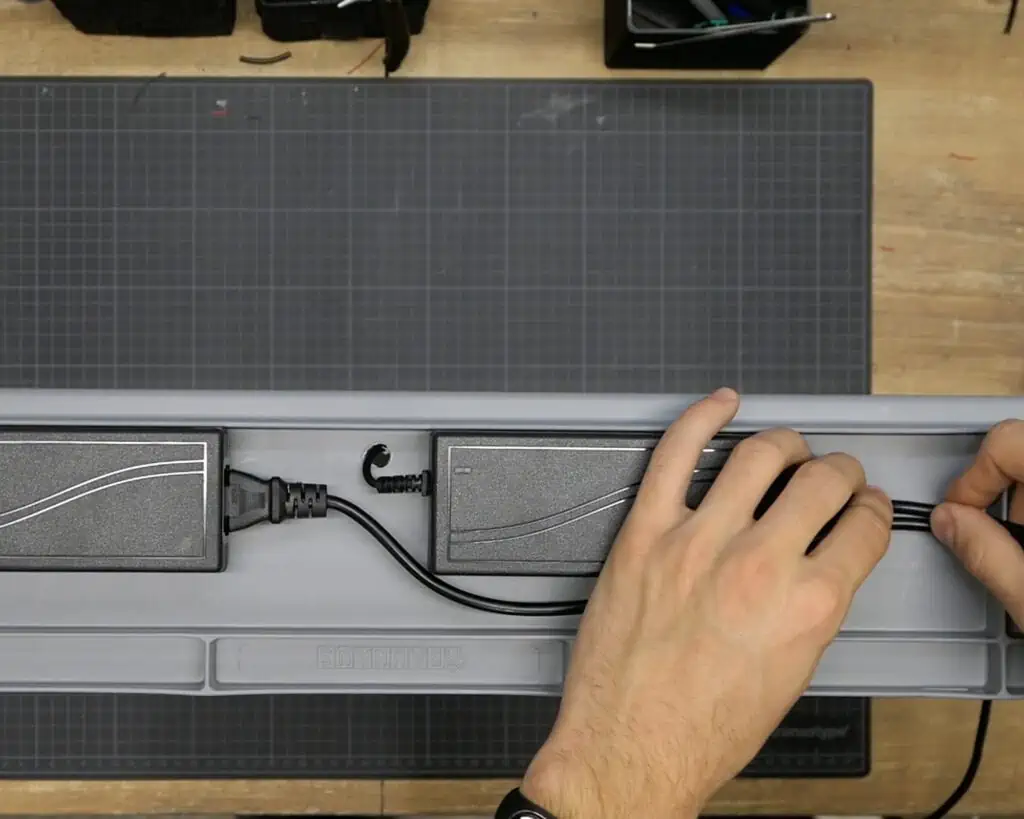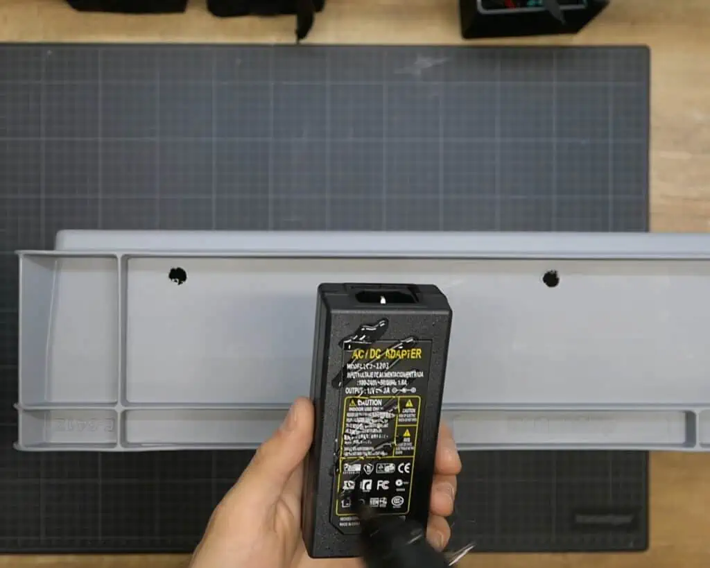 I didnโt want too many cables running on the inside, as they might interfere with the light, so I decided to mount the AC adapters on the outside of the box. They tend to produce quite a lot of heat, and this way, they would be able to release it freely.