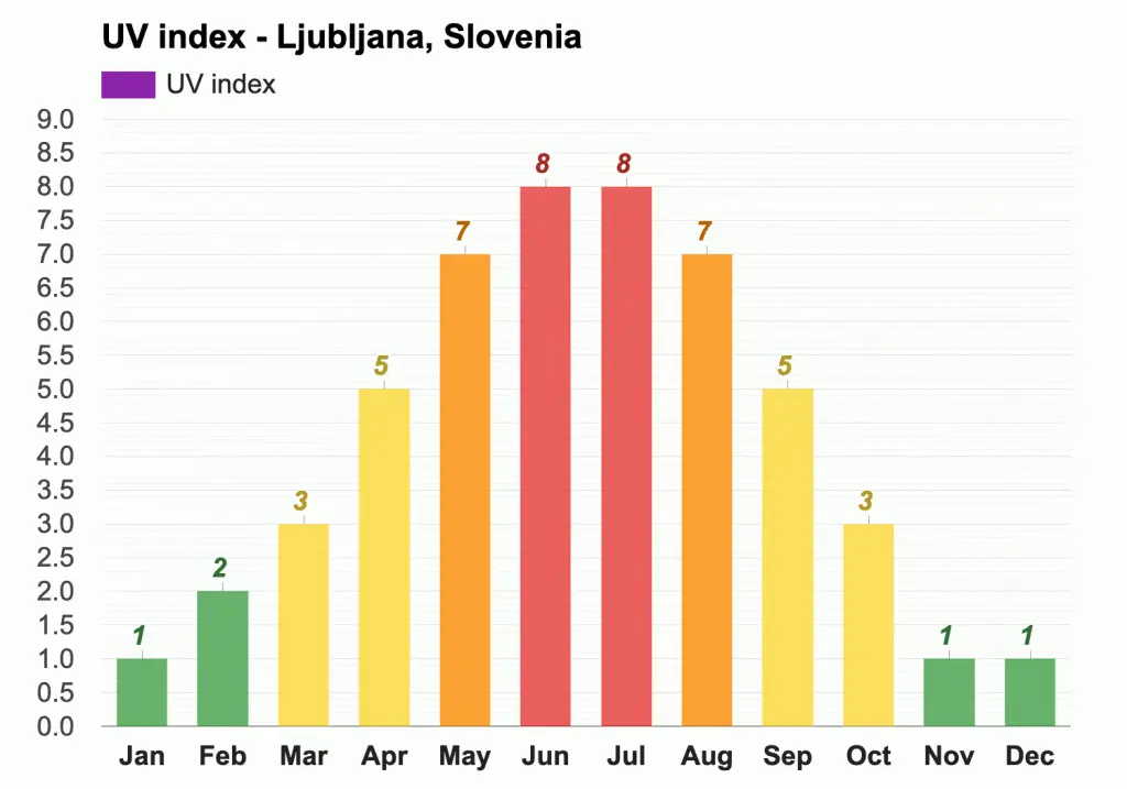 Monthly Exposure Guides where adjusted according to the Slovenian monthly UV Index levels listed in the chart bellow. Depending where you live monthly UV levels can be completely different to ours so adjust exposure guides accordingly.