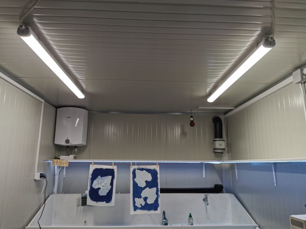 If I had to dim the safelights I was struggling with insufficient lightning on the ceiling when I was making videos for the channel. Originally there was only one long light installed in the middle of both the light and dark part of my Container. This central setup was really problematic because even though the lights are very bright it still did not provide enough light to the sink and the counter. Even worse when I was standing by the counter my body was throwing one big shadow on the counter itself which is a big no go when you try to film what you are doing. In terms of brightness and colour temperature I really like the lights that were originally installed so I bought two more and installed one more into each room. Installation went quite smoothly despite the cable organisation and wiring which is always pain in the ass anyway 😀