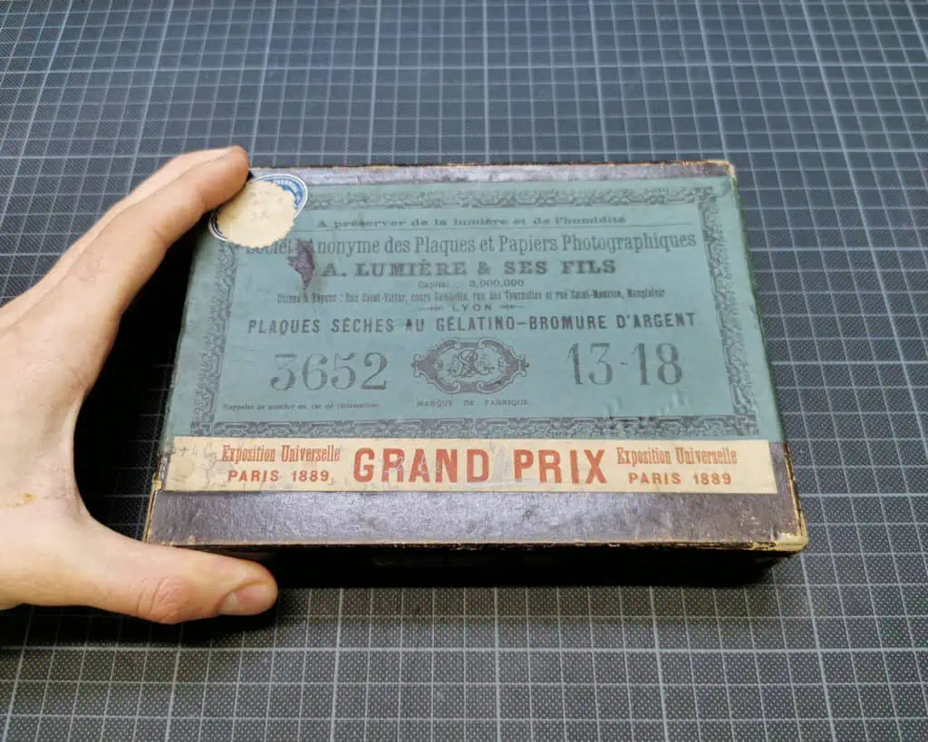 I went on by opening the second package which was bigger and thicker so I thought it has to be a book of some sort. After cutting the envelope and looking inside I just couldn’t believe my eyes. It was a box of dry-plates from the 19th century made by the famous Lumiere Brothers. Auguste and Louis Lumiere were truly masterminds! They were first to make movies by using still images and they take credit for many other important inventions in photography. One of the inventions is the so-called Lumieres “blue plate” that changed the photographic world of the time. Before most of the plates used wet emulsions which meant you needed a darkroom during preparation as well as immediately after exposing the plate. Lumiere plates reduced the darkroom time significantly and from there on their business greatly increased. By 1890 they were producing around 15 million plates per year making them the biggest dry plate manufacturer in Europe. The technique remained the same until today and the emulsion is very similar to the one I use for my dry plates.