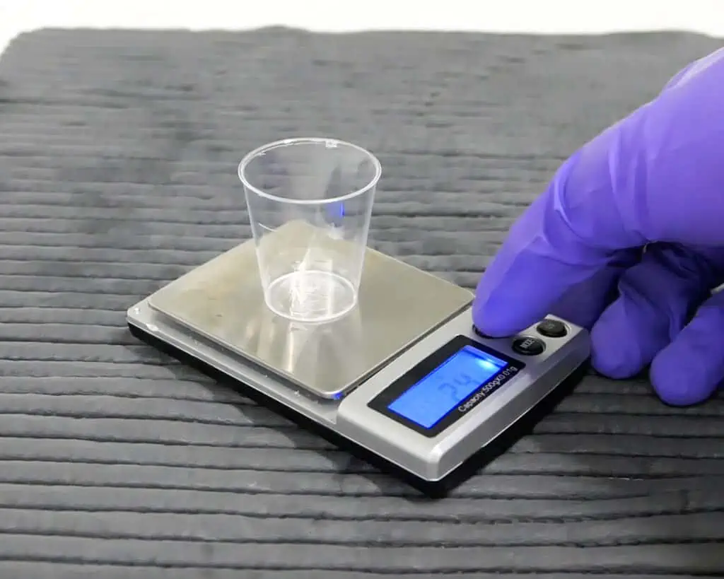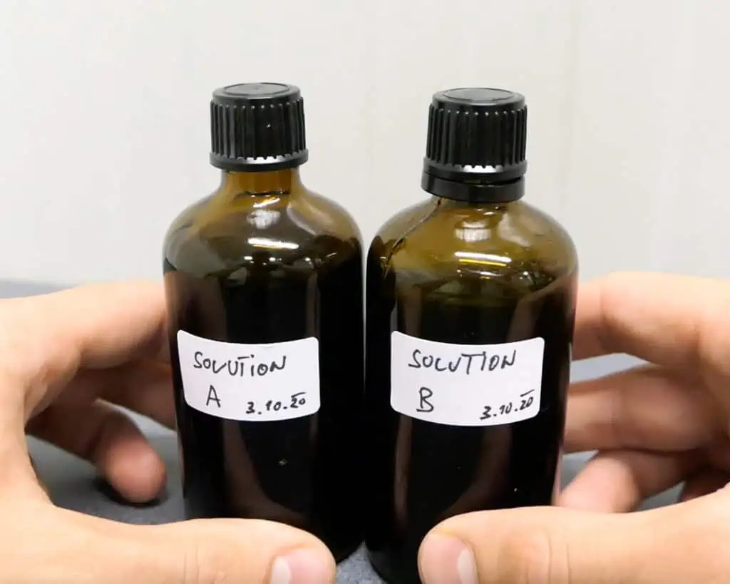 You will need both chemicals, distilled water, a mixing jar or beaker, something to mix with, measuring cylinder or a syringe, storage bottles and a scale. If possible wear gloves and try to do this in a well ventilated area or outdoors (chemicals become sensitive to UV only when they are mixed together).