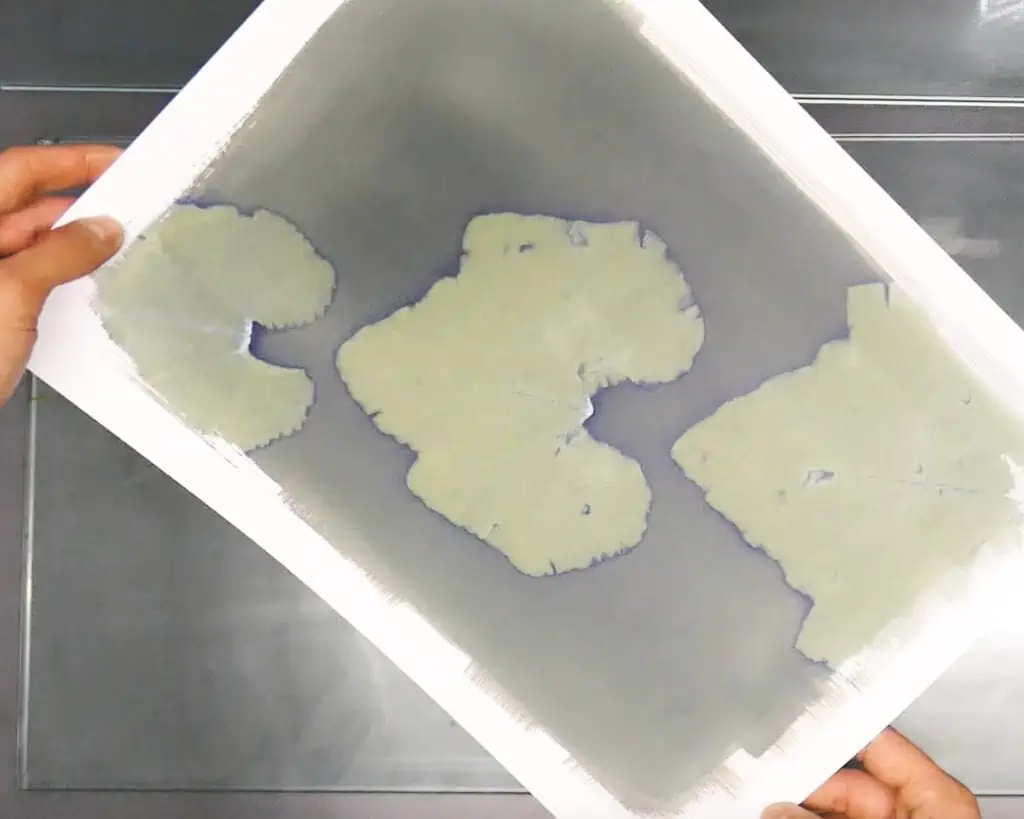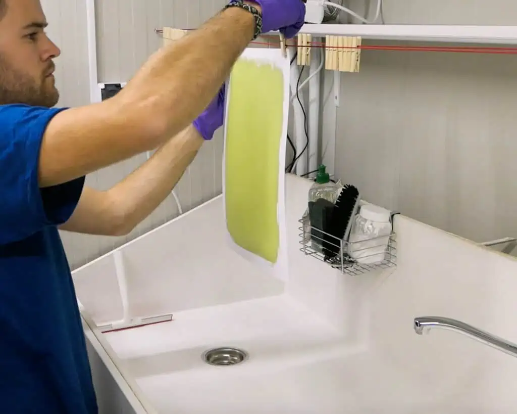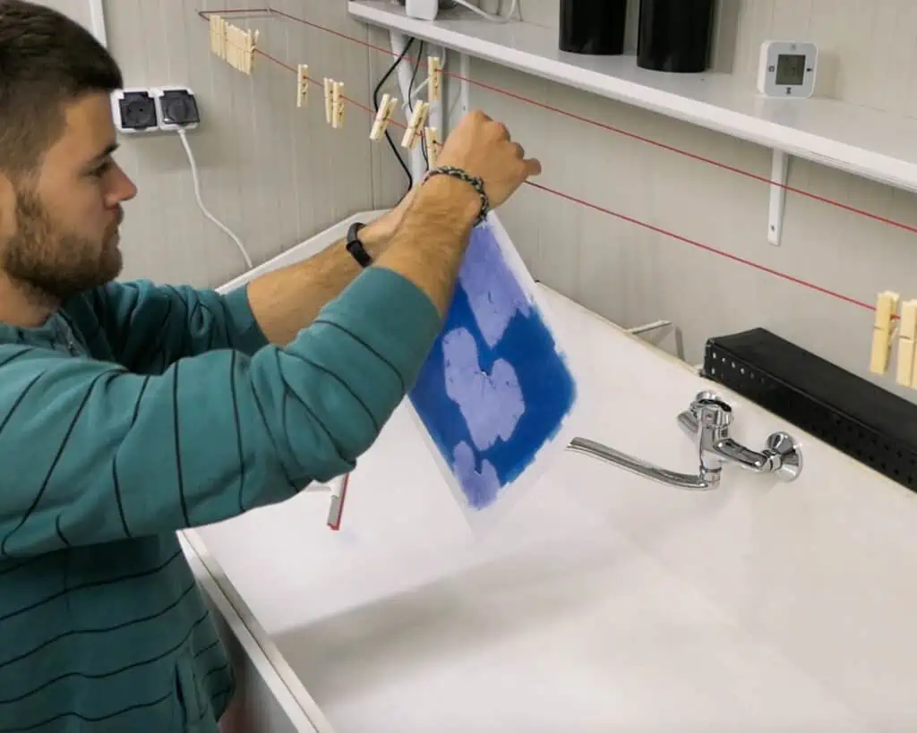 When you have exposed the plate bring it back indoors. During developing all the oxidise particles will wash off and leave a beautiful blue colour behind. For developing all you need is water and a container or sink. You need to wash the paper until the water coming off is clear. Do not use hot water because you will damage the paper!