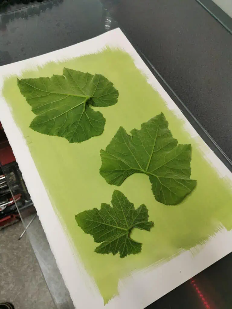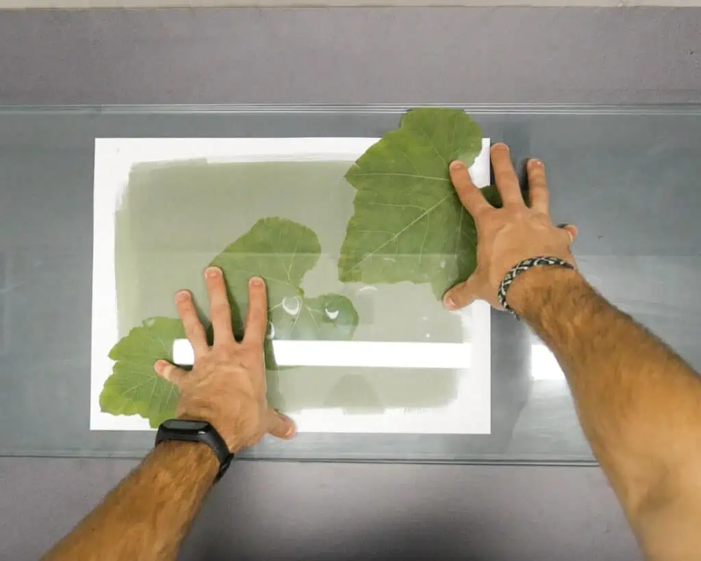 After the paper has dried and you have printing materials you can start placing them on the paper. When you are happy with the composition you need to sandvich everything under a thicker piece of glass which will provide good compression.