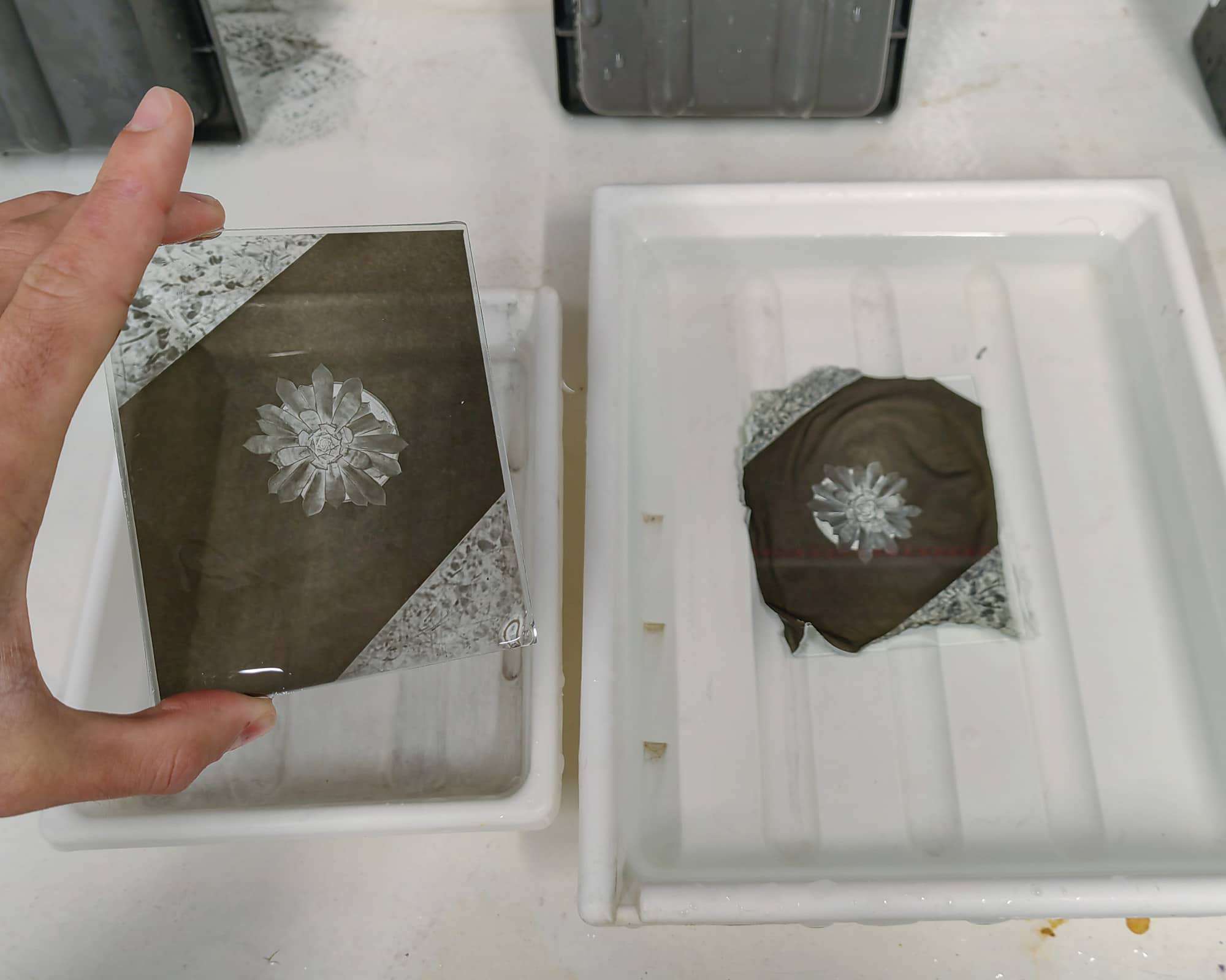 Another way of making emulsion adhere better is adding hardener and there are a few options out there like Chrome Alum, Formalin… When hardener is added to the emulsion there are additional molecular links being made between glass and emulsion making for a much more resilient coating. You would say hardeners are great and indeed they are if you are coating just a few plates for yourself. But for me they were a bit harder puzzle to solve because as soon as you add hardener to the melted emulsion the clock starts ticking and with every minute the emulsion is becoming more and more firm even if you are constantly applying heat and stirring. I coat a couple hundred plates at once and by the 20th plate I would have been left with a slime like emulsion that could not be coated with high quality standards of mine. Yes I could play with the ratios and dilutions but adding too little and there is no hardening effect or adding too much and I can only coat 5 plates at once.