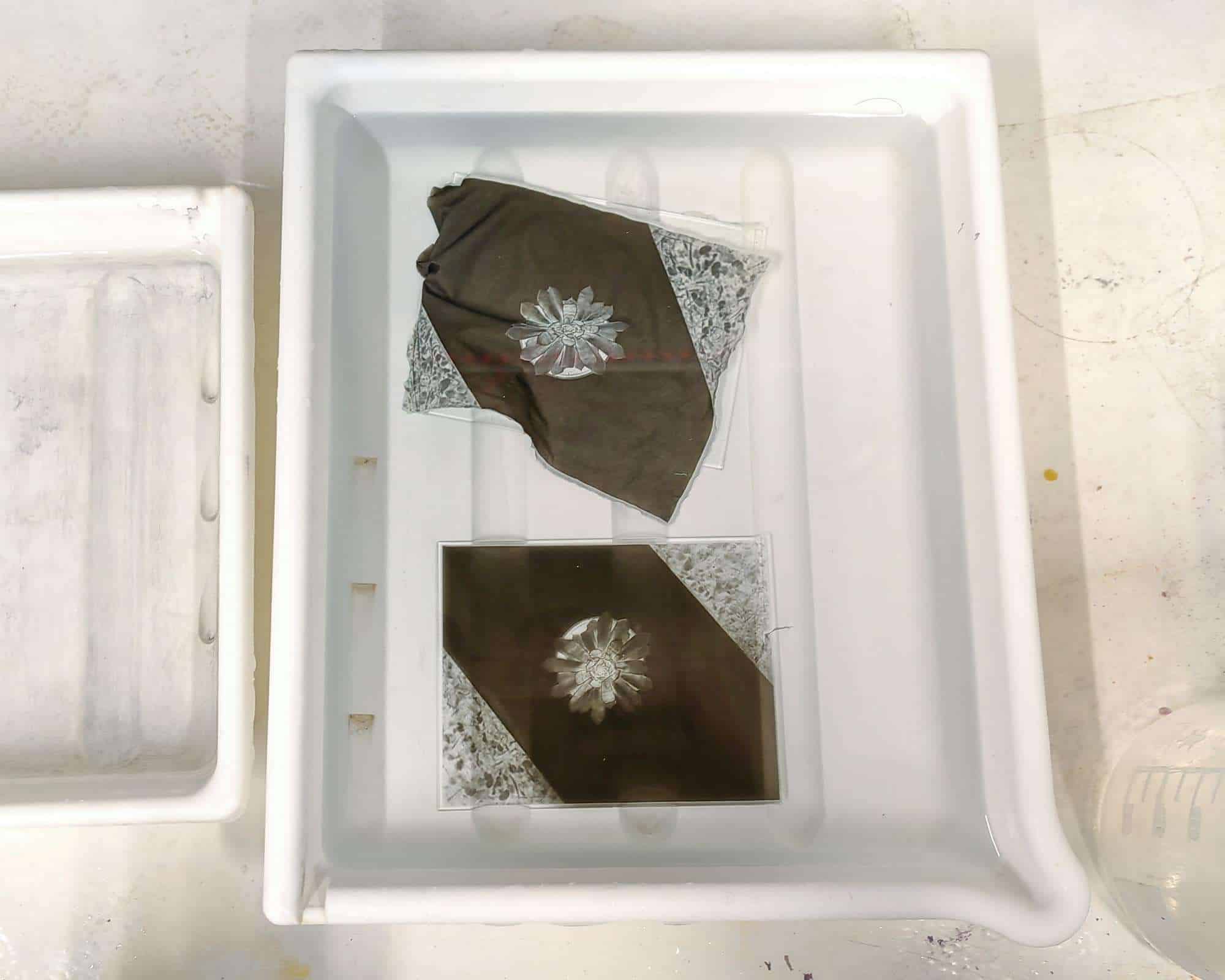 And the second more important one is a test of resilience to extreme chemical treatments. The most extreme test you can make with any gelatine based material is an acidic environment as it will cause emulsion to owerswell literally in an instant. So after development I dipped the plate in a very acidic stop bath. I have done this before and I know that the old emulsion will simply detach from the plate in a matter of seconds. I was not wrong. With the old plates the emulsion started floating freely and the image itself expanded by 30% or so. Then it was time to do the same with New Zebra Dry Plates and to my delight plate handled acid like a champ!