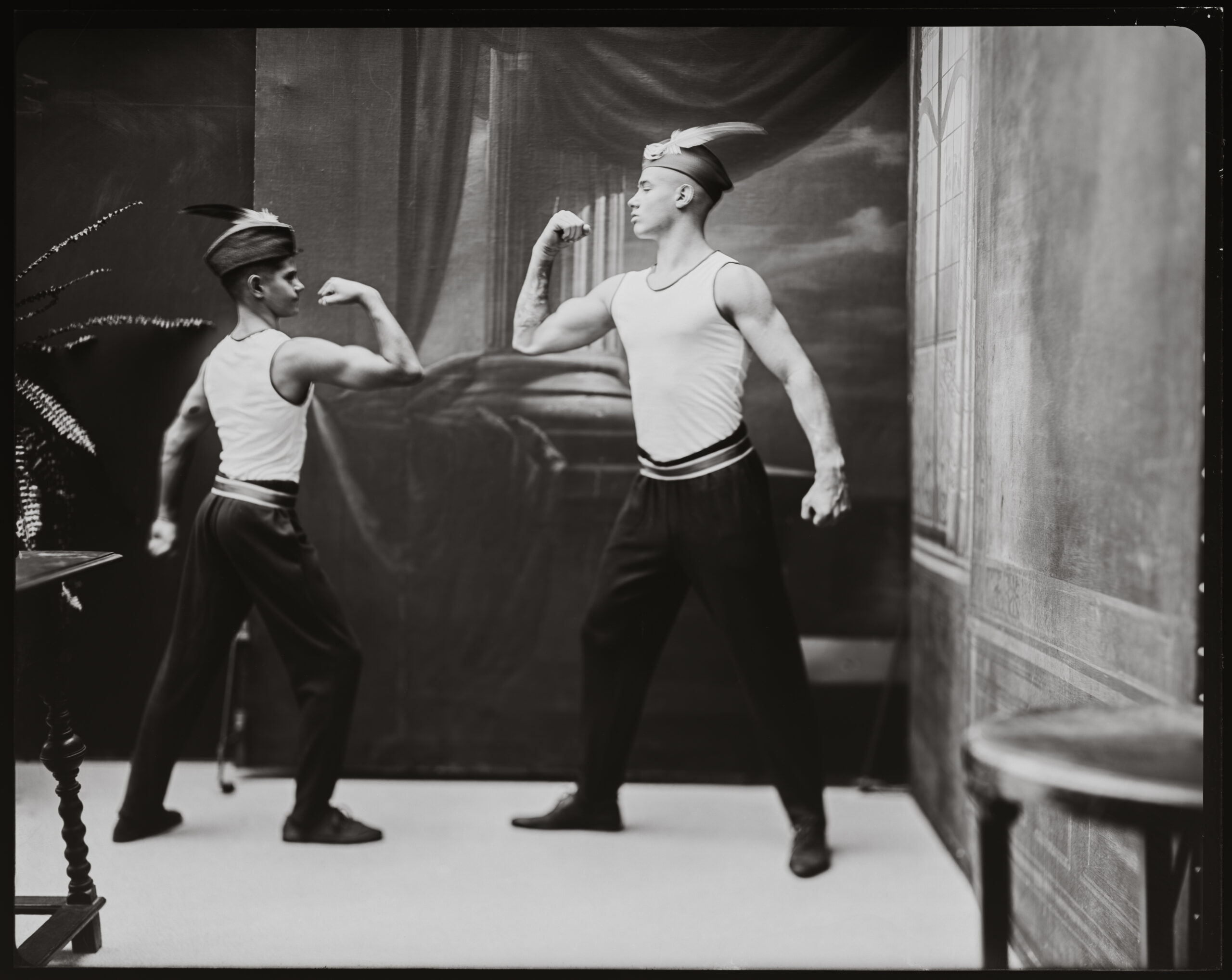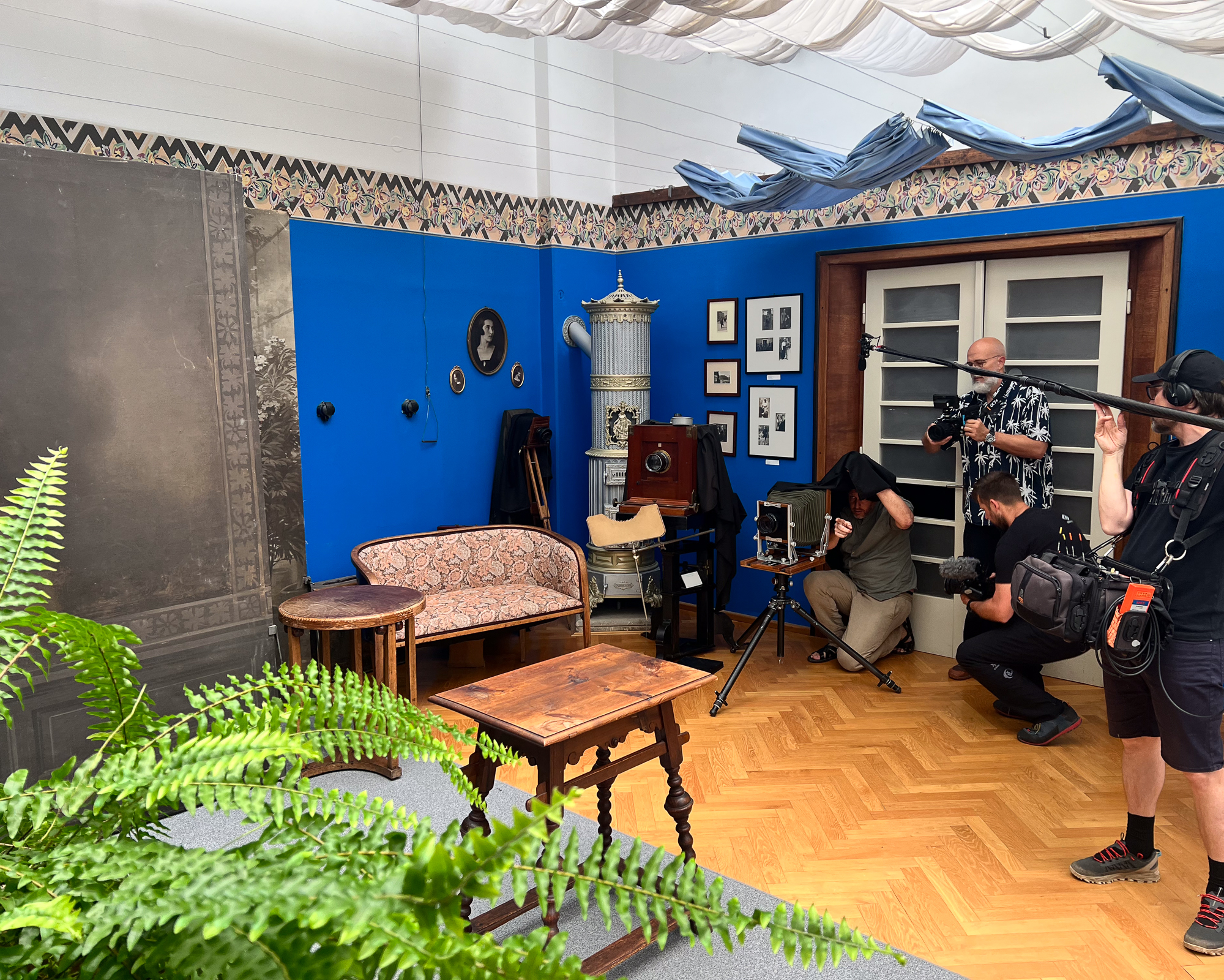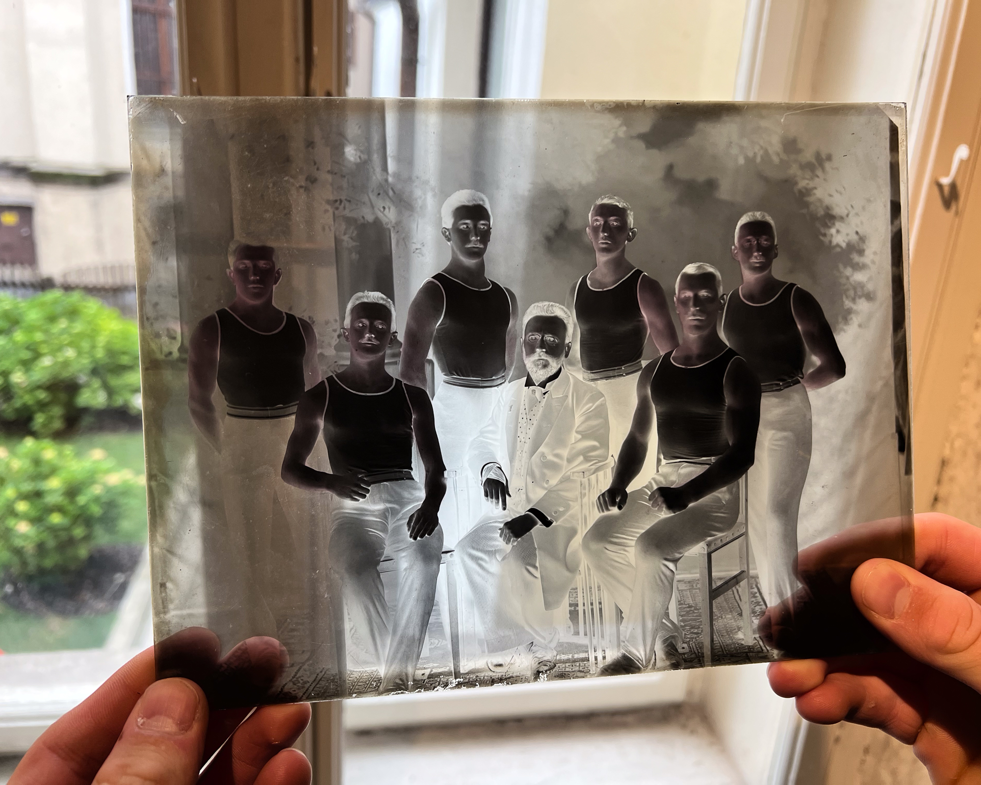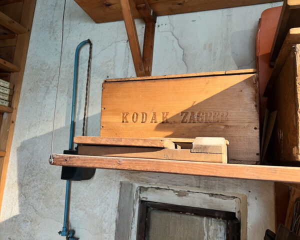 This remarkable studio also became the backdrop for filming scenes of the dry plate photography documentary currently being produced by Slovenia’s national television. We aimed to recreate one of Pelikan’s iconic portraits of a local gymnastics group, an image originally taken right in this very studio, on a glass dry plate.Thanks to the studio’s perfectly preserved setup, and with a little help from me and the Zebra Dry Plates, we were able to produce a remarkably faithful recreation of the original photograph. Working alongside Peter and his beautiful Primer 8×10 camera, we captured the image on standard Zebra glass dry plates. Even more exciting, we had the chance to process the negative in the very same darkroom where Pelikan himself once developed his plates. An unforgettable experience.