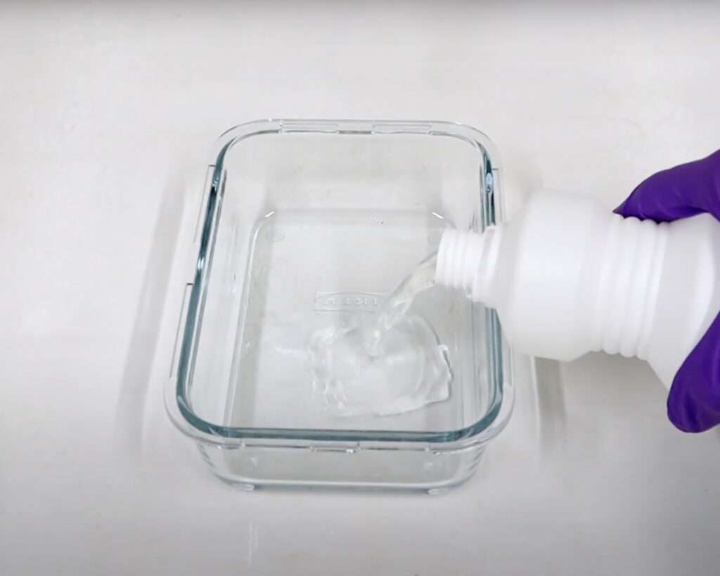 We need something that dissolves the gelatine and that is Sodium Hypochlorite. I know it sounds complex but it can be found in most bleaches for clothing. This is a Slovenian version of it.