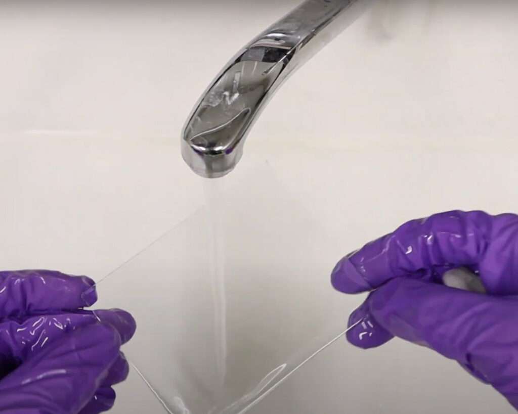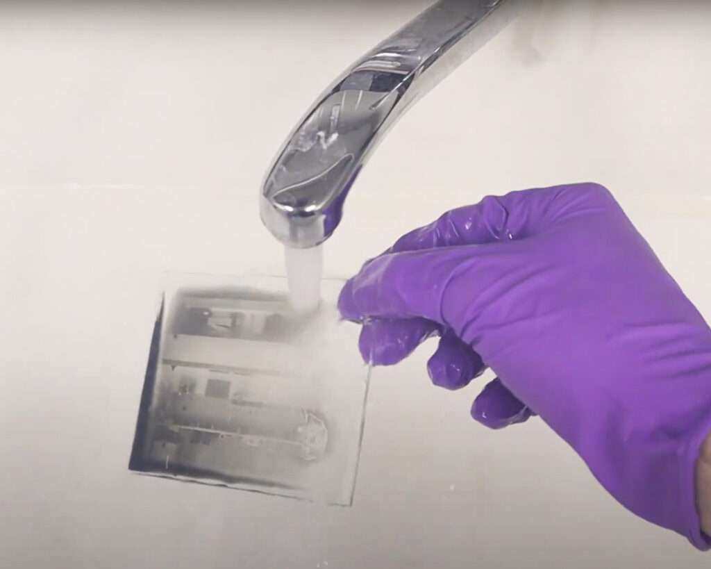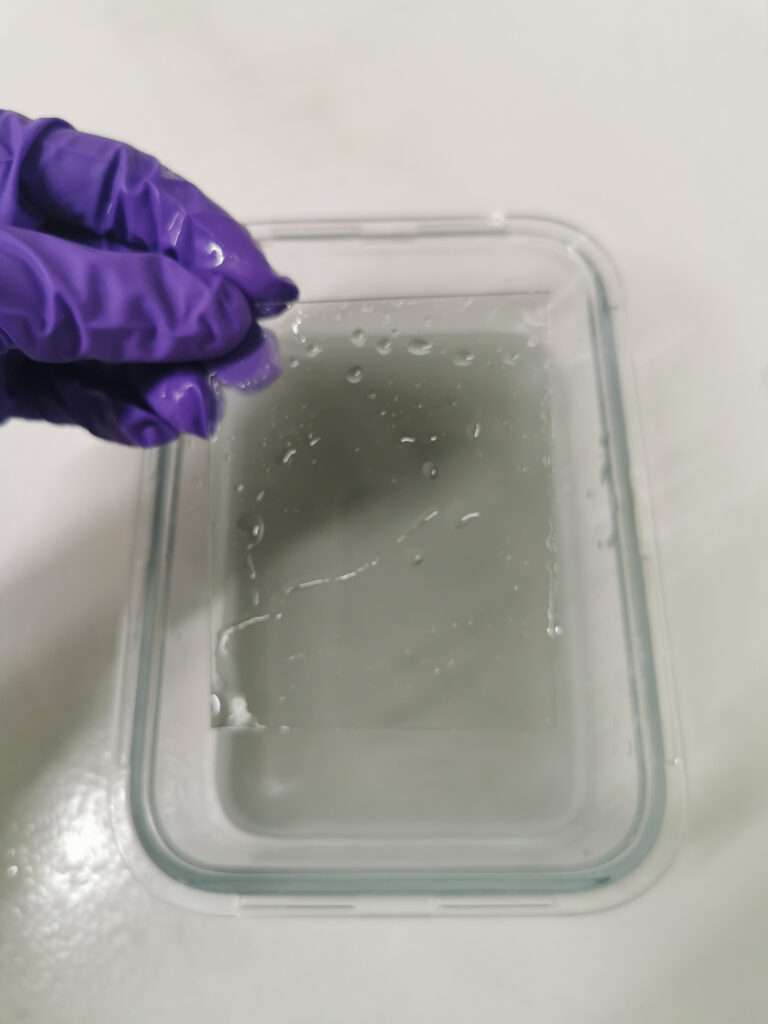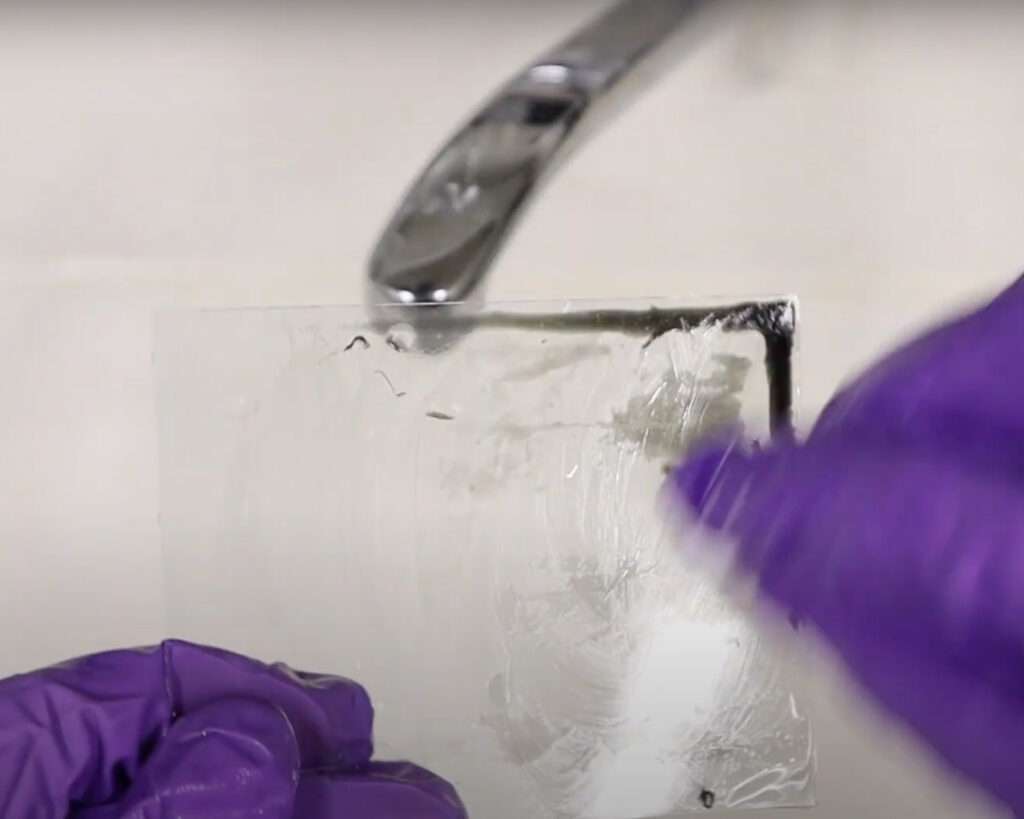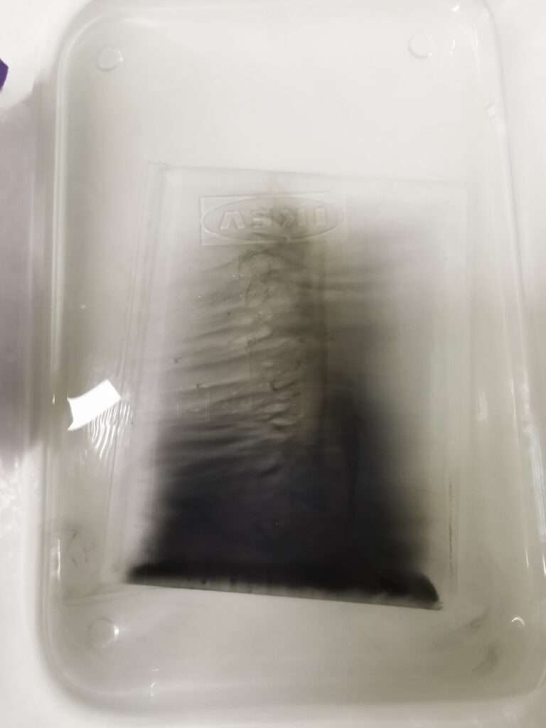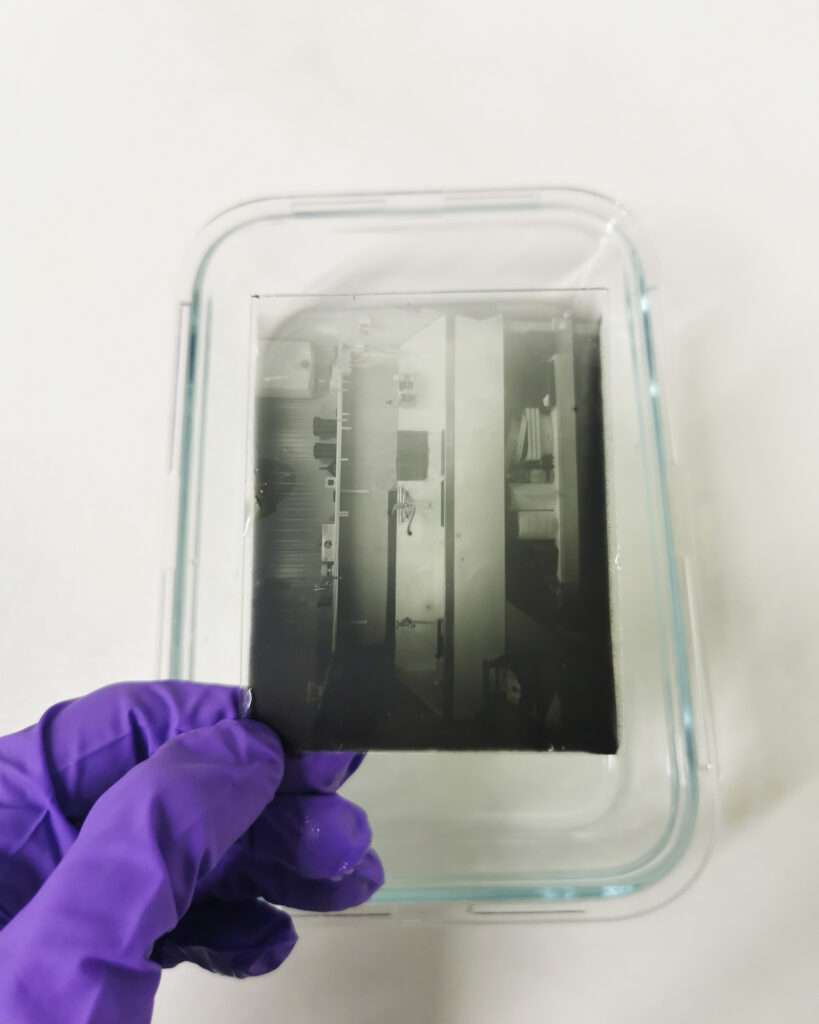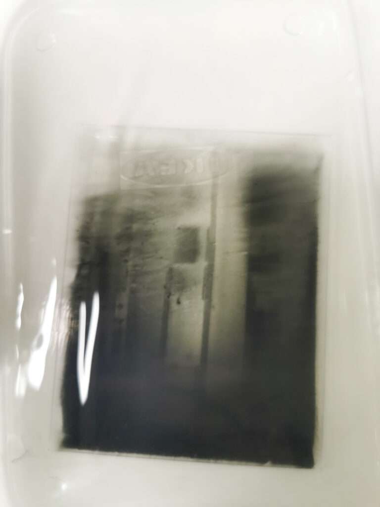 Here is an example of a dry plate that was coated with emulsion that contains hardener. You can see that it is not going anywhere even if the water is hot up to 70 C.