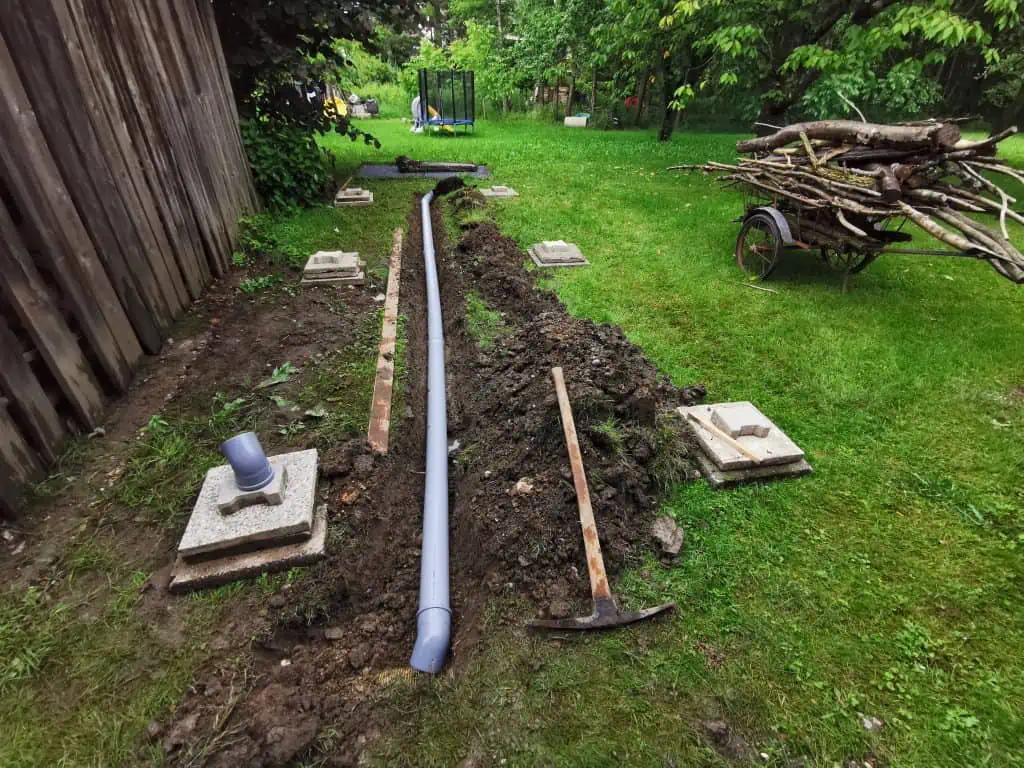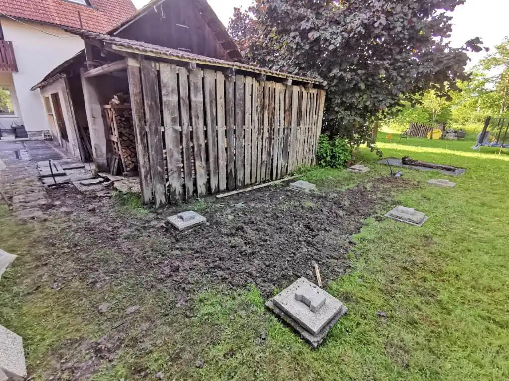 Weeks went by quickly and soon there was just a week left to the arrival of container and I had so much work to do. I had to dig a chanel for the suage and water which was quite a hassle specially after 2 weeks of rain. At the end everything went as planned pipes where laid underground so last and most important thing that had to be done was foundation. I was looking thru different options from, poured concrete pillars to full concrete base etc. At the end I decided to go for more of a “temporary” solution. Container will be located on grass so what I did was put down 5cm thick 50x50cm concrete slabs for 6 support points and then simple paving stones to lift it off the ground a bit. Container is only weighing around 2 tons so for now this solution is looking rock solid.