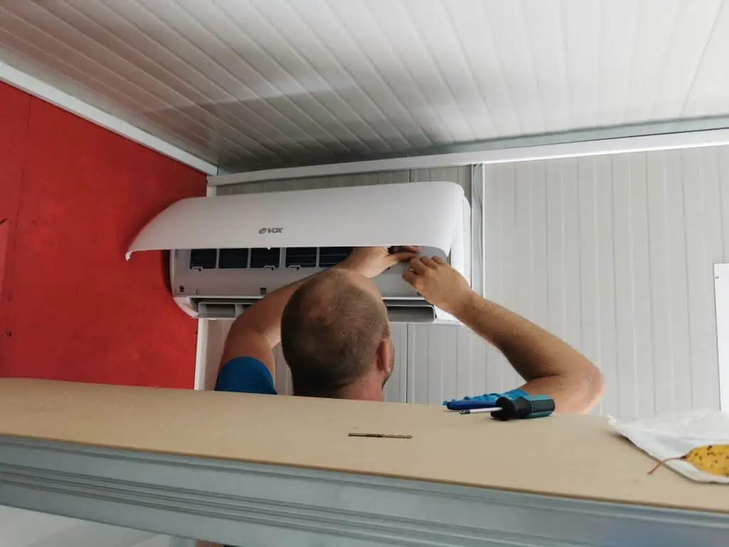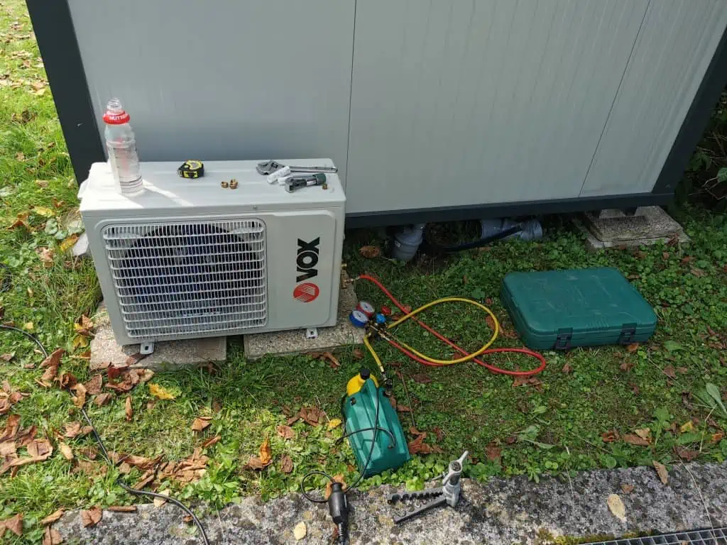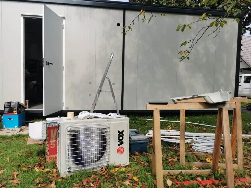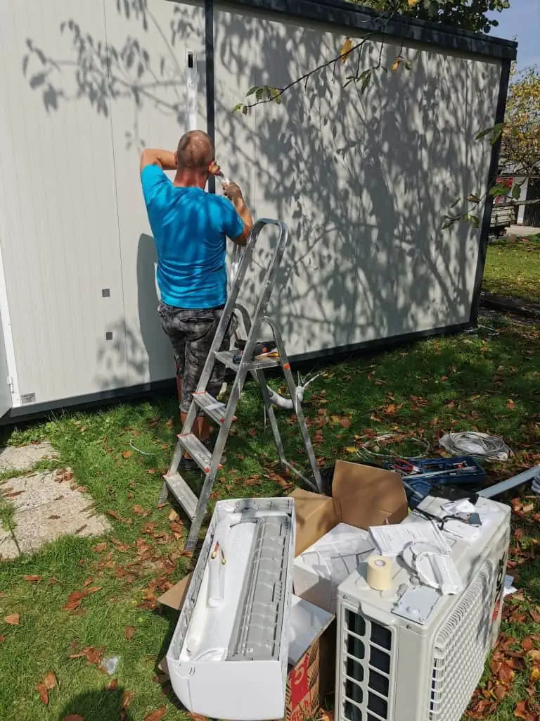 If you have ever been mounting the AC you probably know that outdoor units can be quite loud and create a lot of vibrations so when the installer came he proposed to just put it behind the container on the ground. Underneath we just put two 50x50cm concrete slabs so it is stable. With this solution it is not causing any vibrations and can easily be unplugged if I will be moving the container in the future. We worked on it for around 3h before everything was finished. He was connecting the pipes while I added a new fuse in the box just for the AC and did all the wiring.