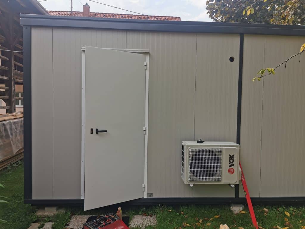 Container is looking more and more like a darkroom. I have done quite a lot of work inside lately especially wiring which was exhausting. I really respect all the people in the construction industry after the work I have done. Container without AC is like a greenhouse reaching up to 35 °C (90°F) and pulling cables through the wall and mounting them is like working in hell. So my main focus now was how to cool everything down. As the winters can be quite cold here in Slovenia the best solution for me was to get an AC. At the start I thought I would be able to instal it by myself into the light part of the container but it turned out to be a bit more difficult task than I imagined. I started by making another hole thru the container where all the wiring would go thru connecting the indoor & outdoor unit. Then I have been thinking where would be the best to instal the supporters for the outdoor unit and somehow I ended up installing it in front of the container just right of the door. When everything was screwed to the wall I started looking for other installation material.