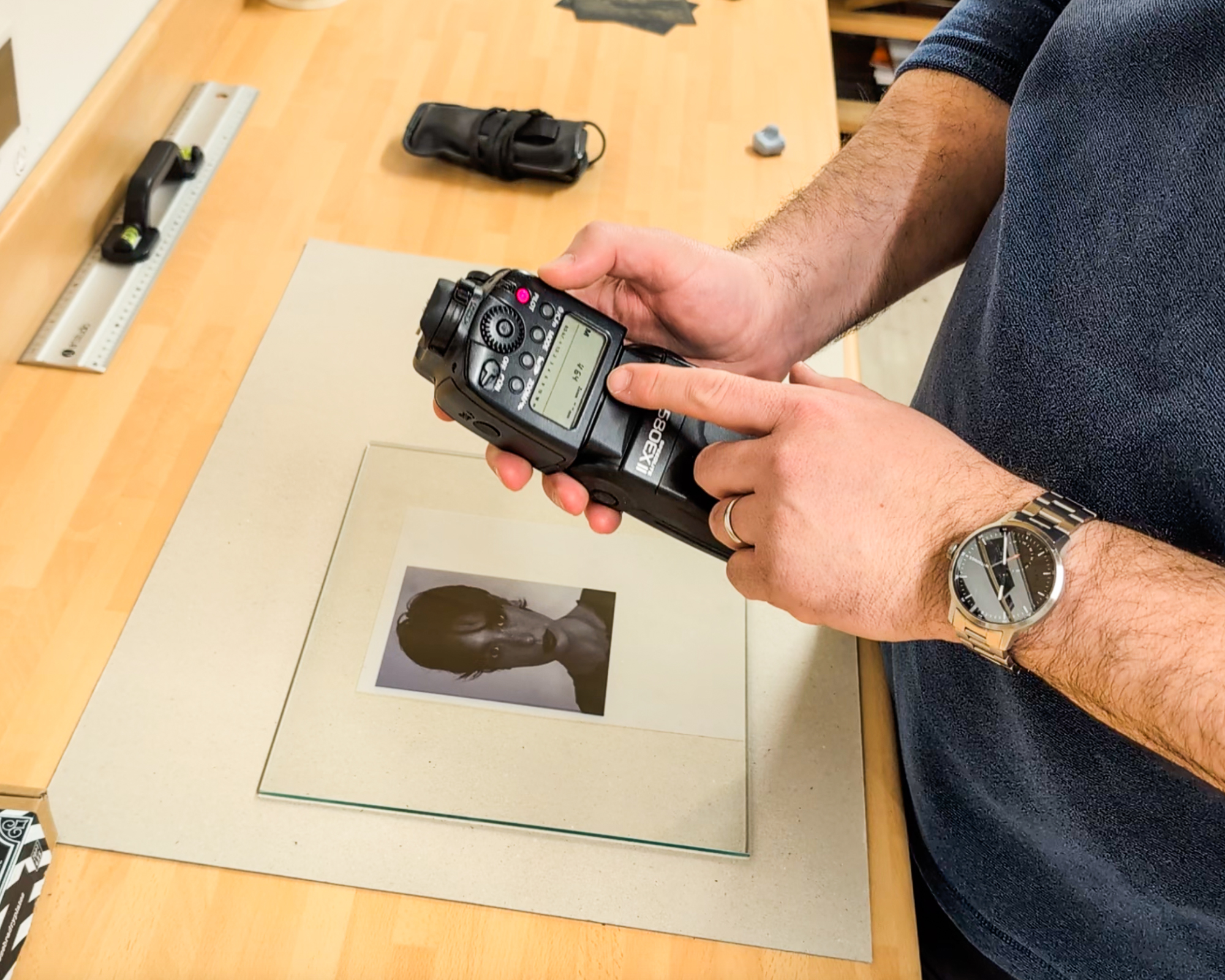 If you don’t have access to a flash, you can also work with a darkroom enlarger. However, you’ll need to run exposure tests (such as using a step wedge) since each enlarger produces different power output depending on the light source, projection lens, distance from the print surface, and other factors.