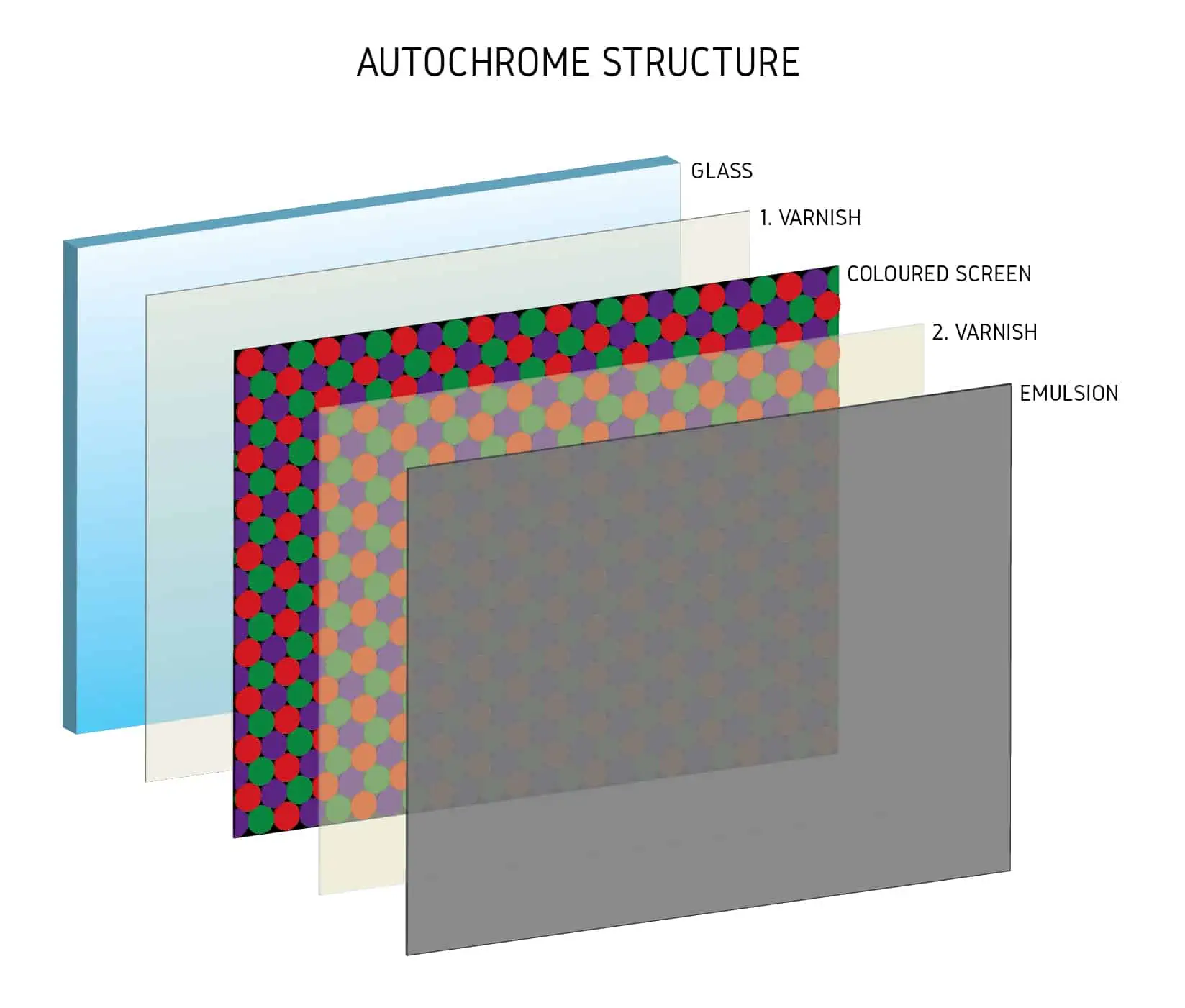 We can put autochrome in the section of photographic techniques that base on additive colour synthesis . Its a composite of glass base which is coated with thin layer of sticky varnish, dusted with starch coloured in three colours, sealed with second varnish and coated with light sensitive emulsion. Before autochrome the photographer had to make three different negatives with three different colour filters. The biggest advancement of autochrome plate was the coloured screen, which consists of micro filters of potato starch coloured in three colours (red-orange,blue-violet, green). During exposure the plate is inserted with emulsion side facing away from the light source so the light travels and filters thru coloured screen first before it makes a mark on emulsion. Because of many layers exposures where pretty long. When the plate was developed to positive b/w image acts as a filter that allows more or less light to pass thru each particle of coloured screen. When we shine the light thru the developed plate microscopic colour particles join their different values together and the optical additive colour mix is made resulting in photograph with wide range of colours. Yes I know its complicated for me writing and for you reading this thats why I made some graphic sketches to cool down your brains a bit