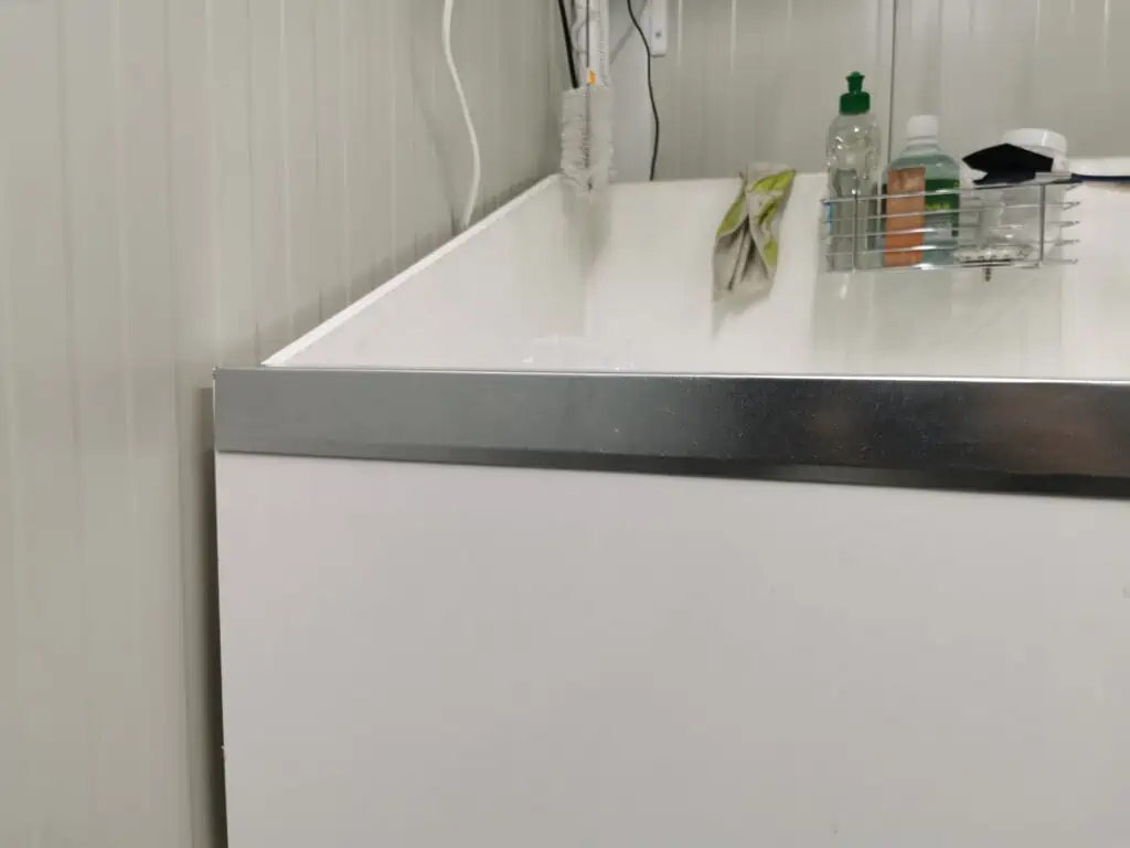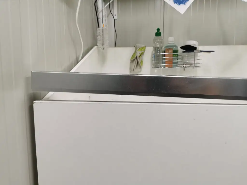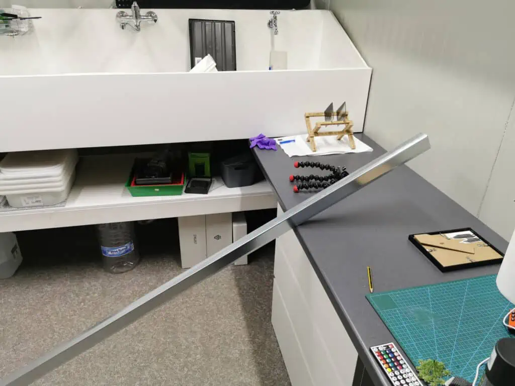 With the help of my father in law we also built a metal channel that was installed on the front edge of the sink. Previously I have attached another piece of white chipboard to the front panel of the sink to make it a bit thicker and nicer to look at. With this I have created a gap on the top thru which water and other more nasty liquids could penetrate. Now after I installed the metal channel on the top this gap is sealed. There was no glueing or screwing needed as the channel is designed in a way that it crimps well to the surface. I had many requests to also film myself while I built these things in my darkroom and upload them to my YT channel as well. What should I say it’s coming!