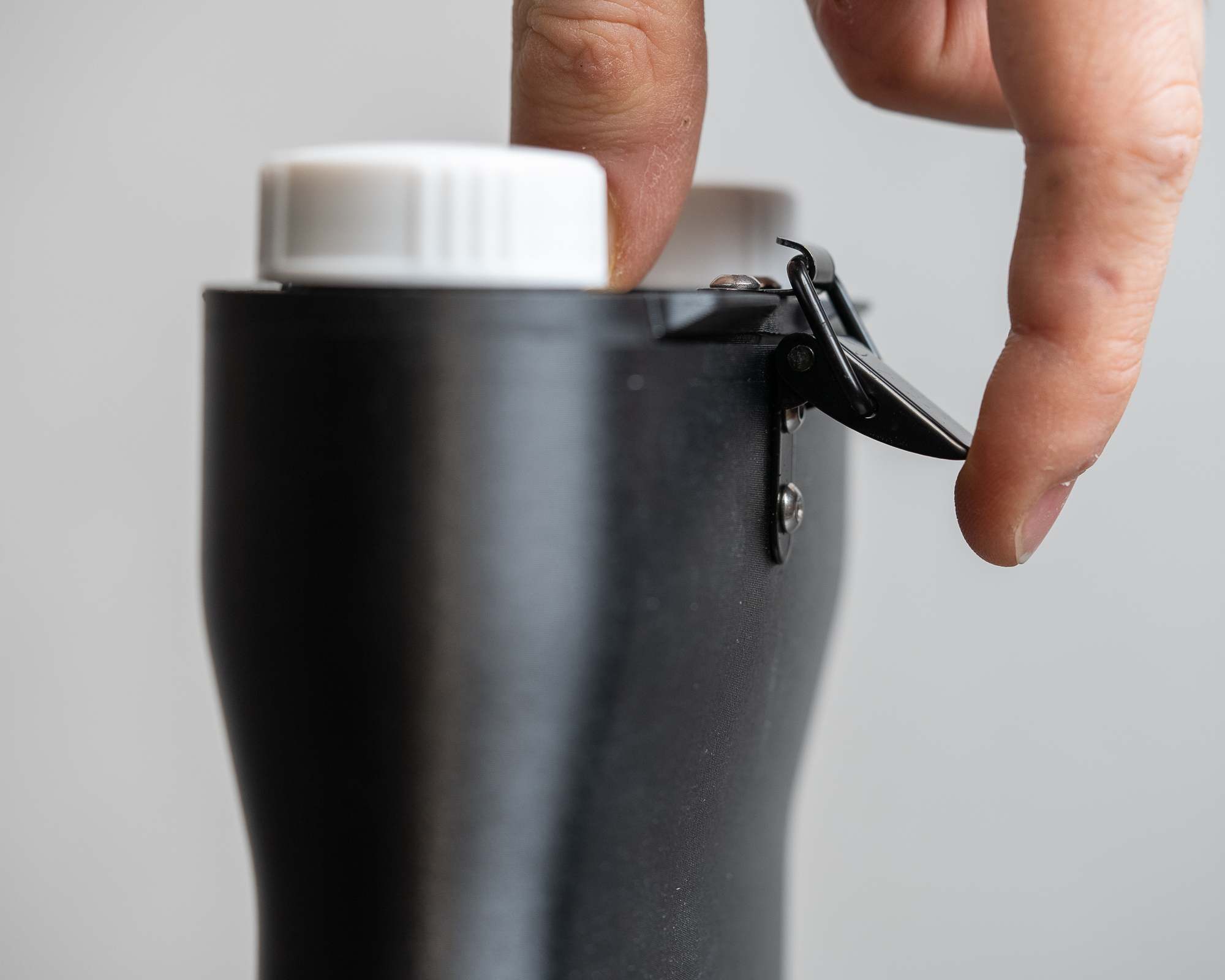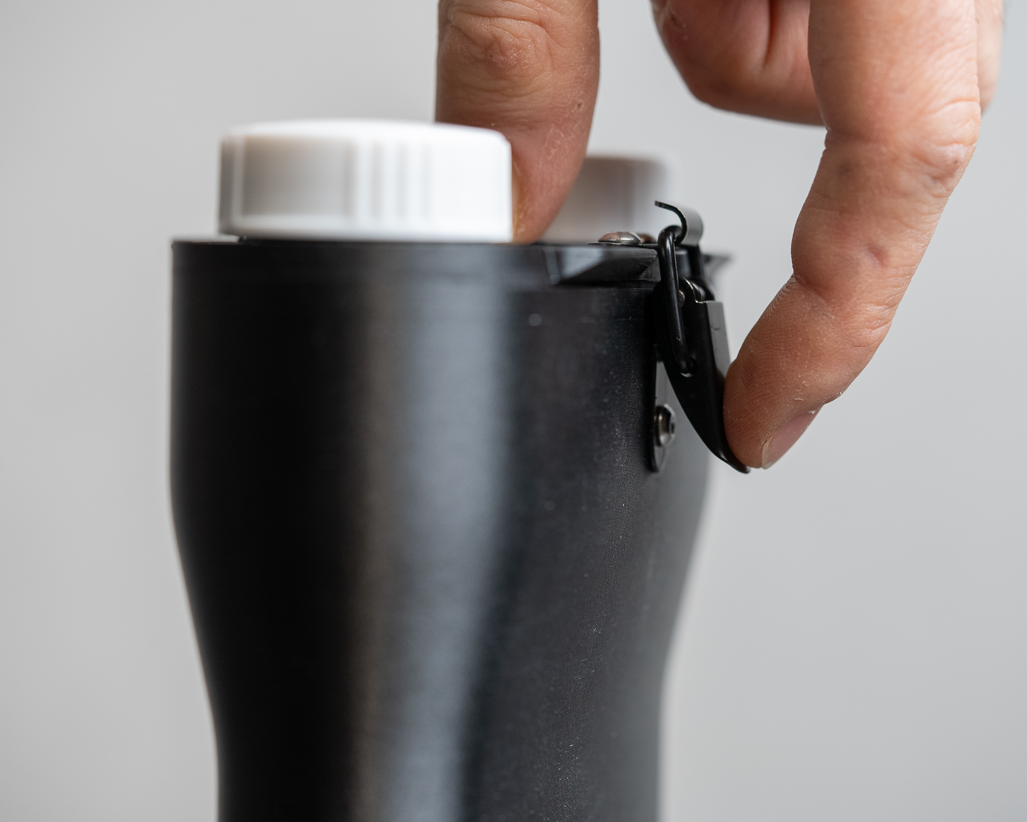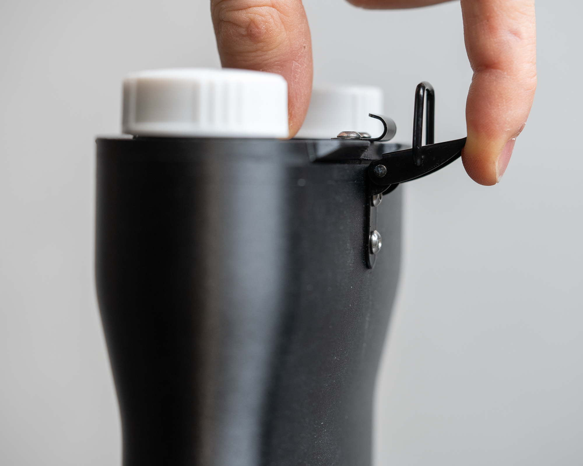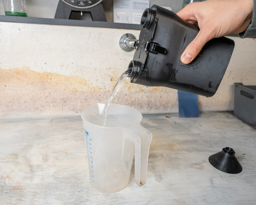 Ensure both caps are fully removed before draining to allow smooth and controlled liquid flow. Tip the tank onto one side and allow the chemistry to drain completely. Always drain into a wide-neck bottle or a large measuring jug to minimize splashing and spills. Make the initial tilt decisively and in one continuous motion, as a hesitant or slow tilt can cause liquid to run down the outside walls of the tank.