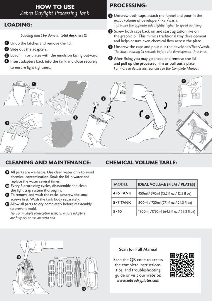 For any issues, questions, or if you require additional help or clarification, please contact us by email at zebradryplates@gmail.com. We are always happy to assist and support you in getting the best possible results from your Zebra Daylight Processing Tank.